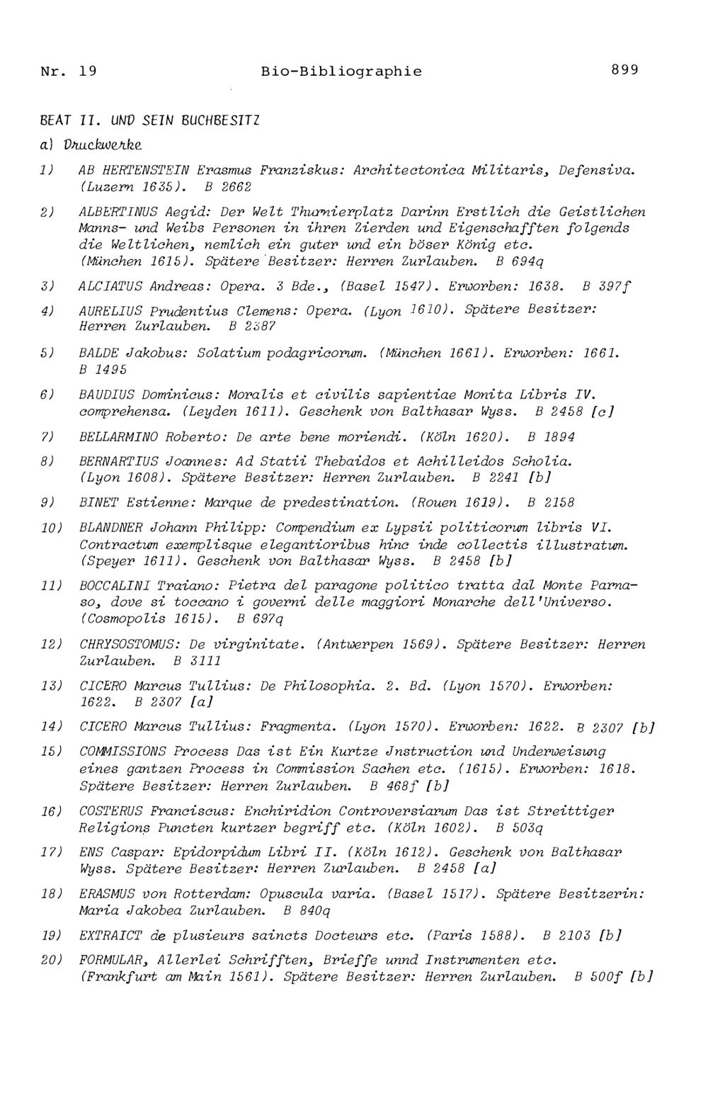 20. Bibliograohie der Arbeiten von Beat Fidel Zurlauben