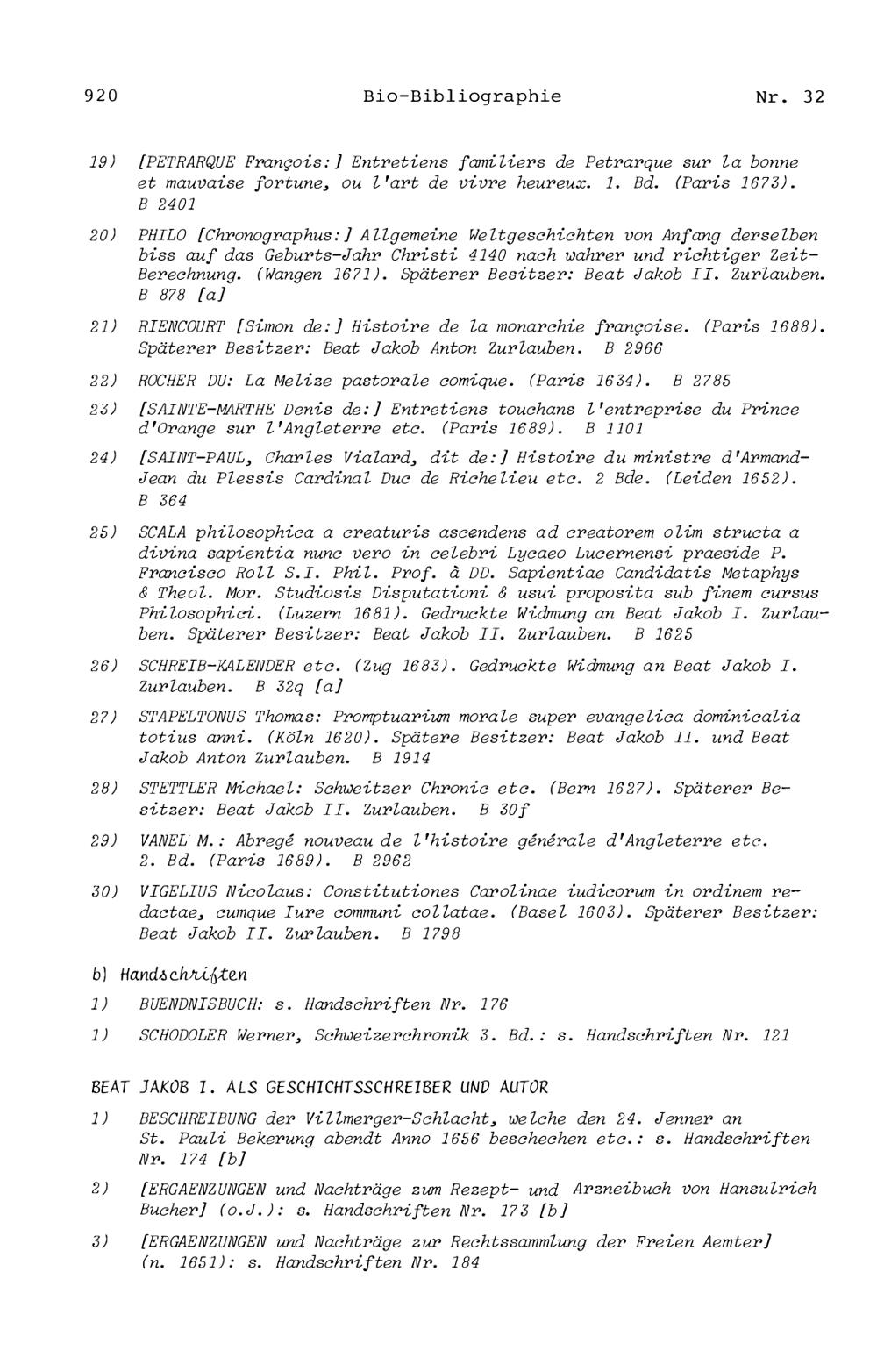 20. Bibliograohie der Arbeiten von Beat Fidel Zurlauben