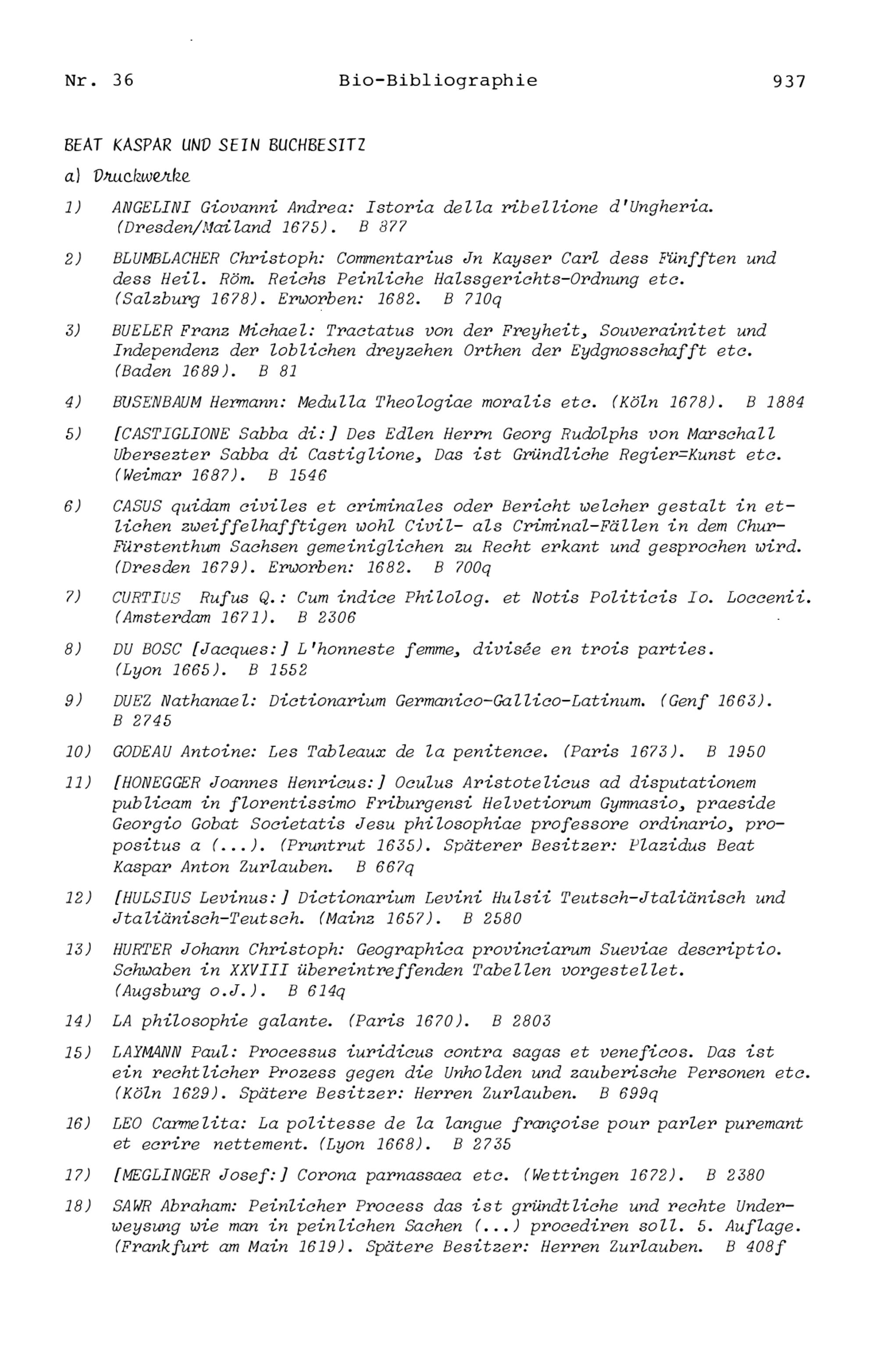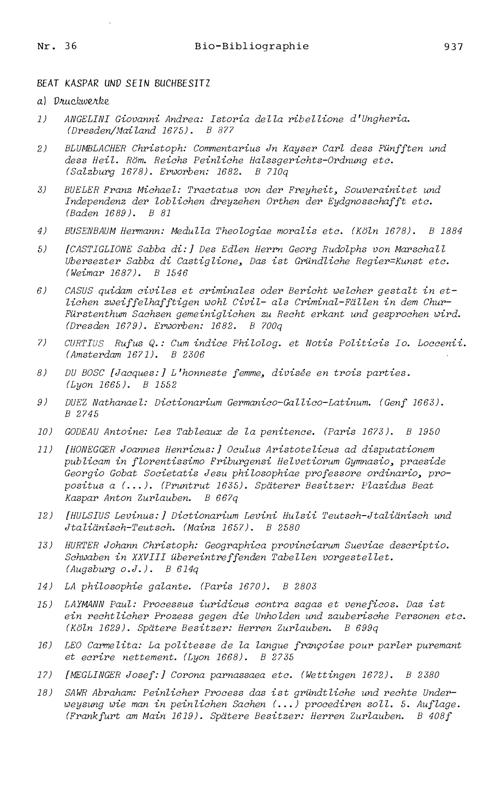 20. Bibliograohie der Arbeiten von Beat Fidel Zurlauben