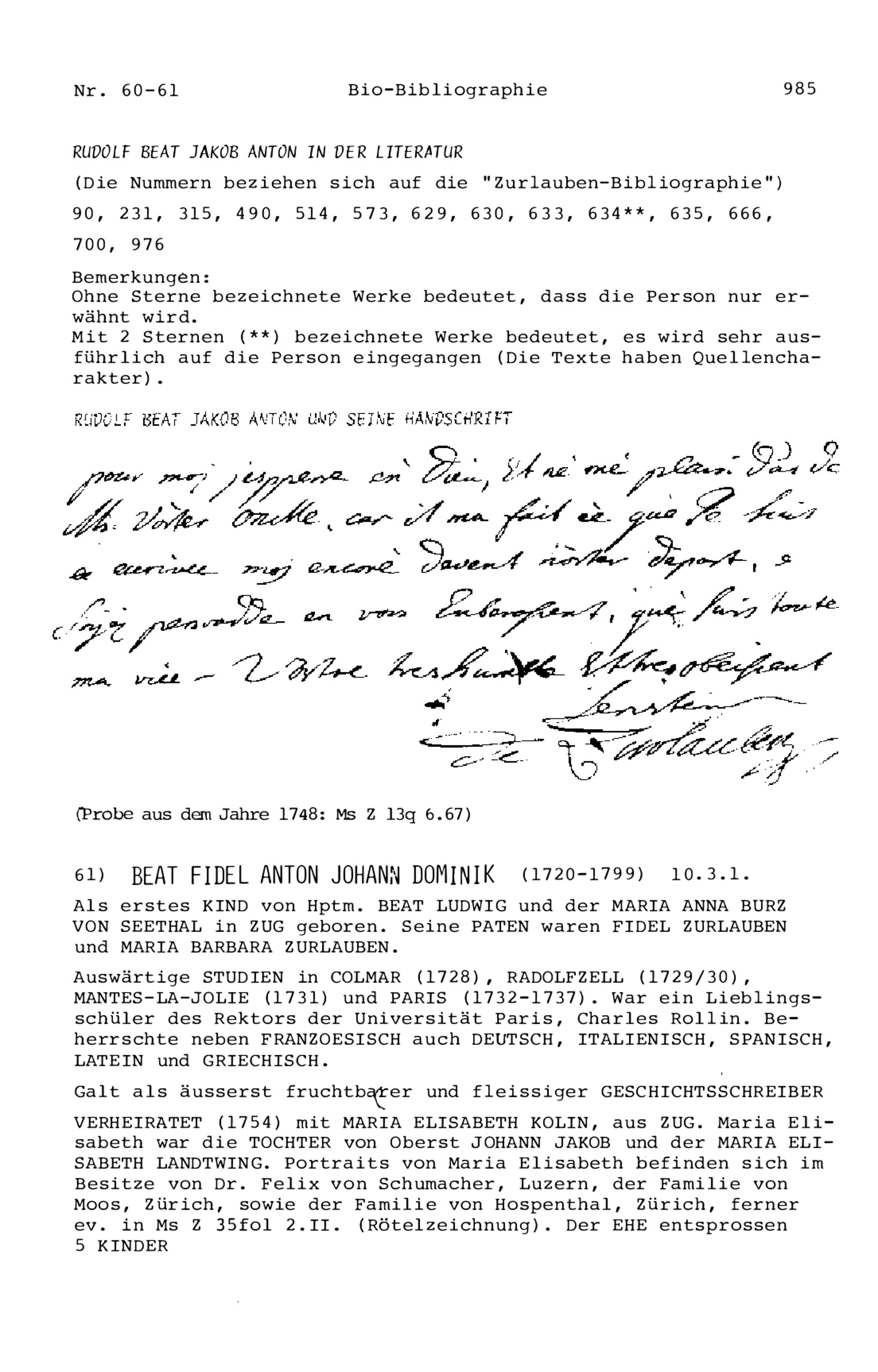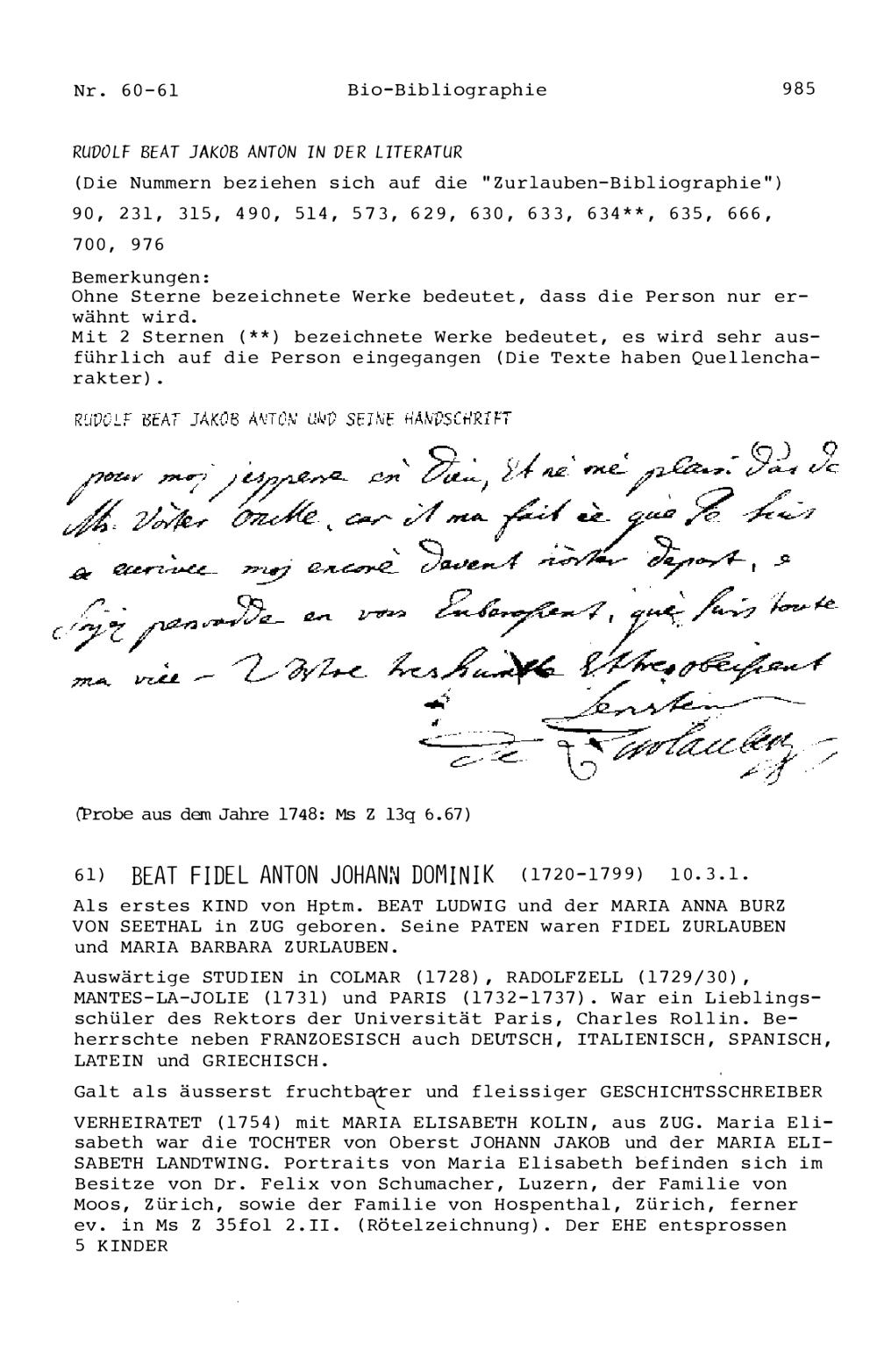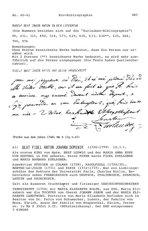 20. Bibliograohie der Arbeiten von Beat Fidel Zurlauben