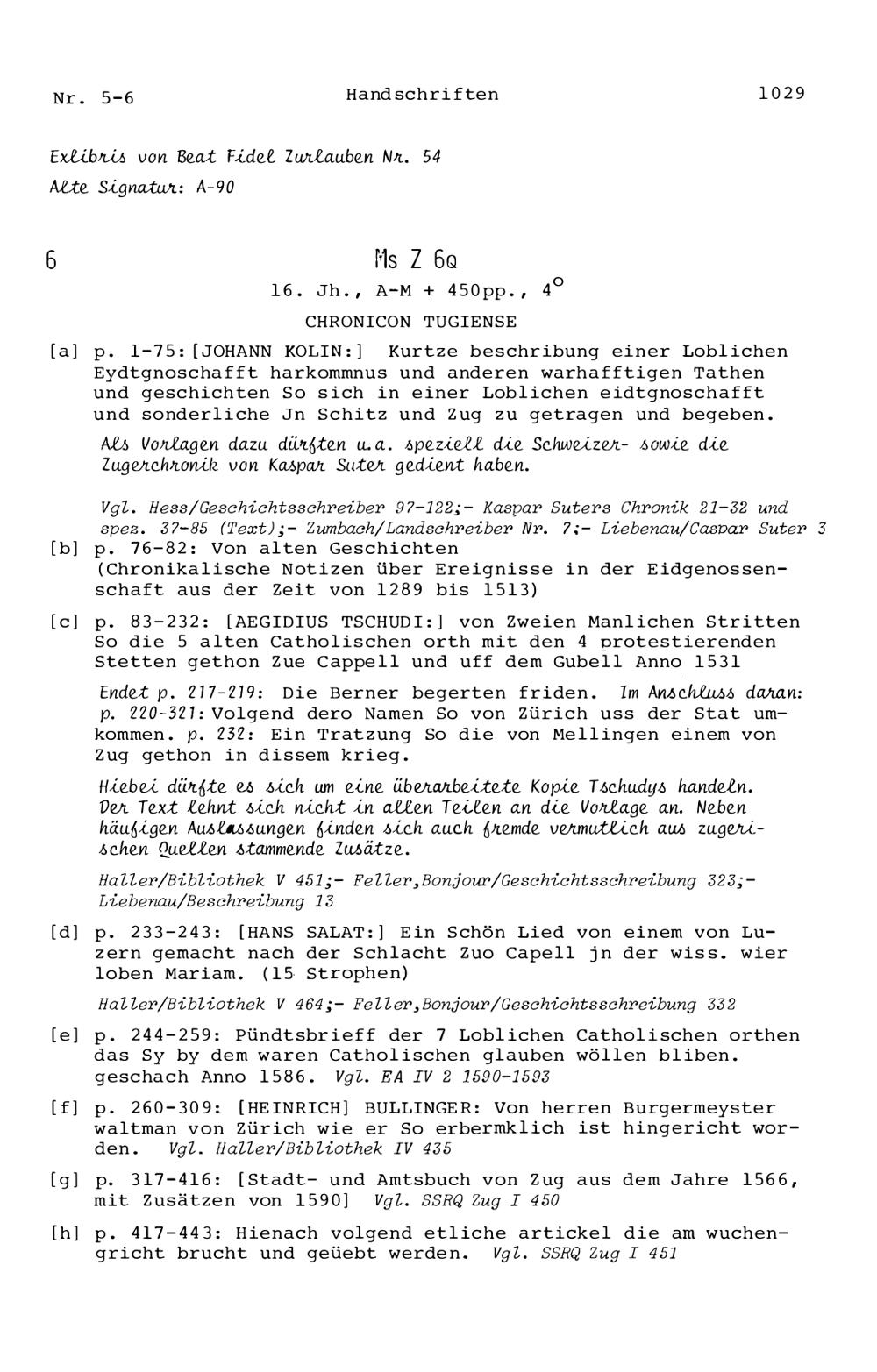 20. Bibliograohie der Arbeiten von Beat Fidel Zurlauben