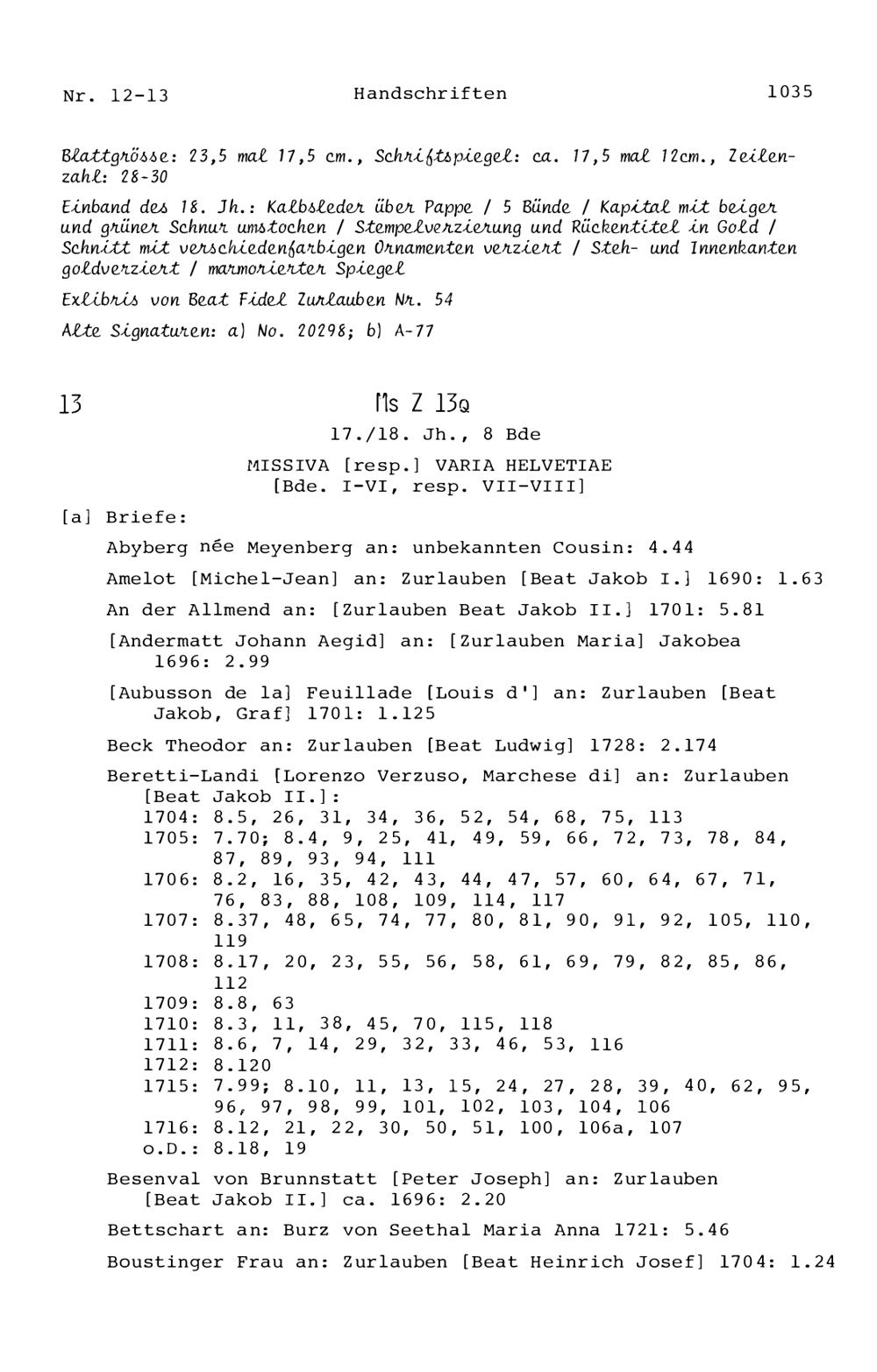 20. Bibliograohie der Arbeiten von Beat Fidel Zurlauben