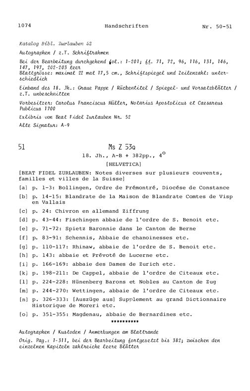 20. Bibliograohie der Arbeiten von Beat Fidel Zurlauben