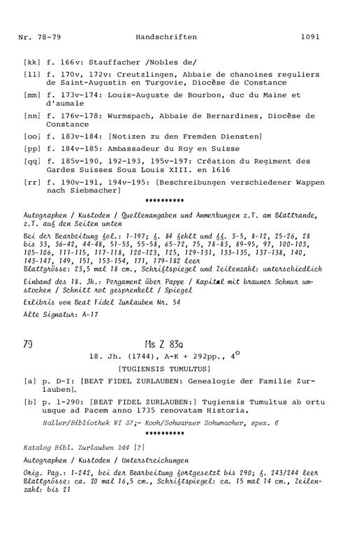 20. Bibliograohie der Arbeiten von Beat Fidel Zurlauben