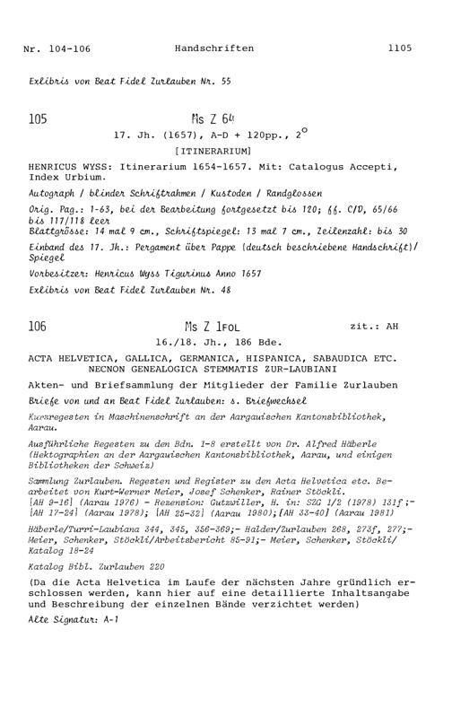 20. Bibliograohie der Arbeiten von Beat Fidel Zurlauben