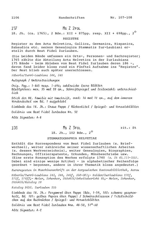 20. Bibliograohie der Arbeiten von Beat Fidel Zurlauben