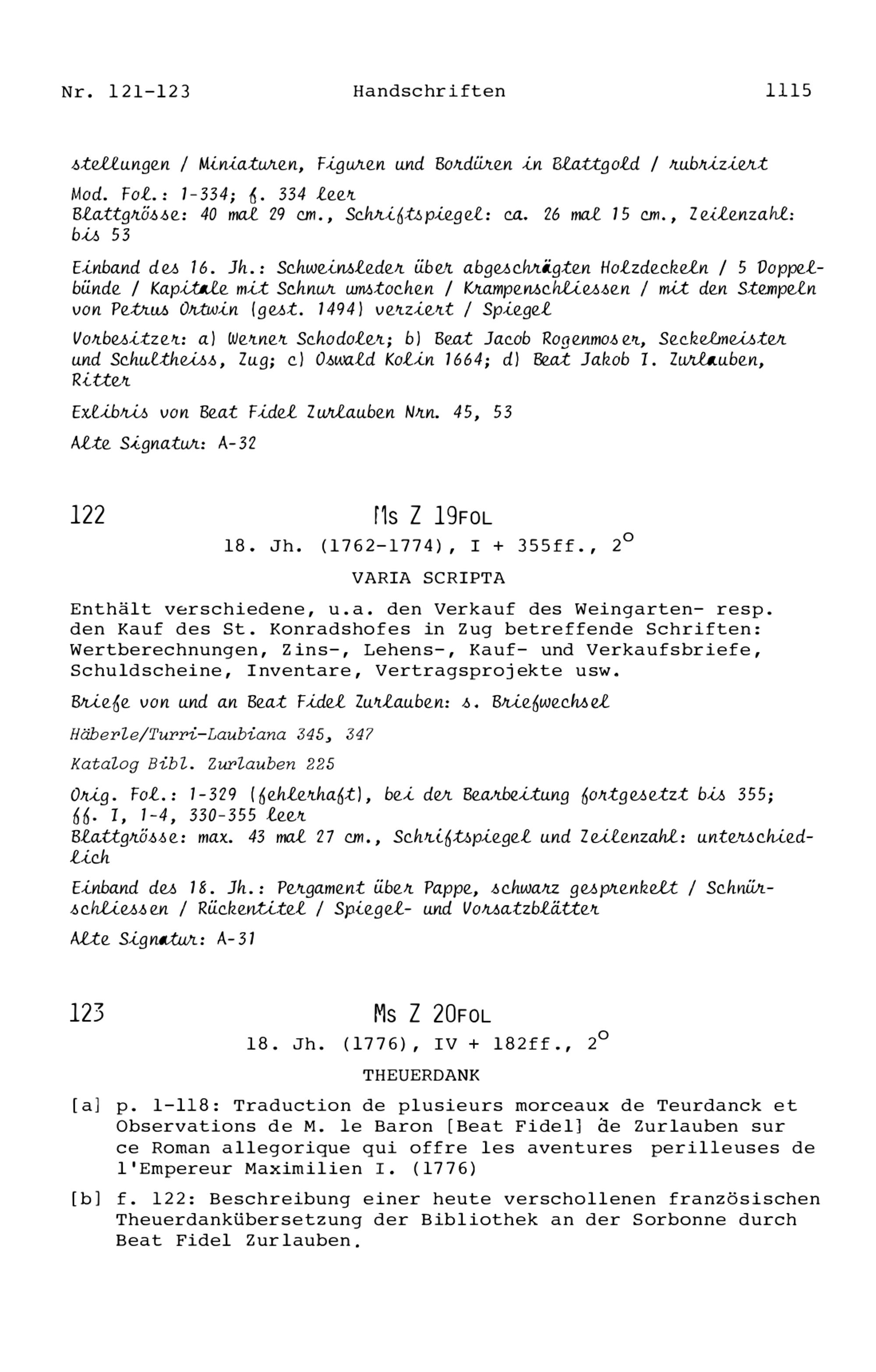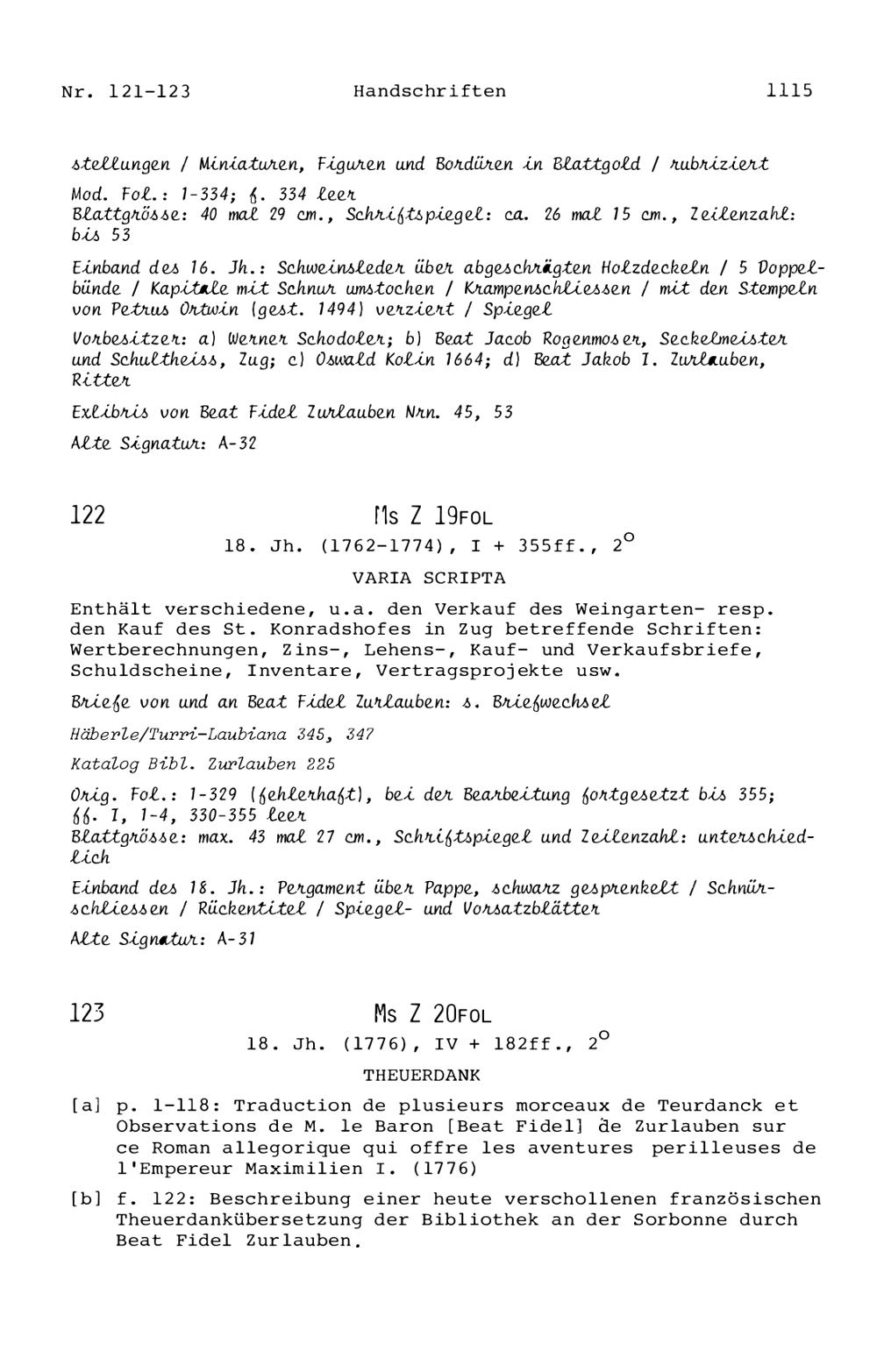 20. Bibliograohie der Arbeiten von Beat Fidel Zurlauben