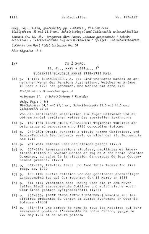 21. Register zu den Arbeiten von Beat Fidel Zurlauben