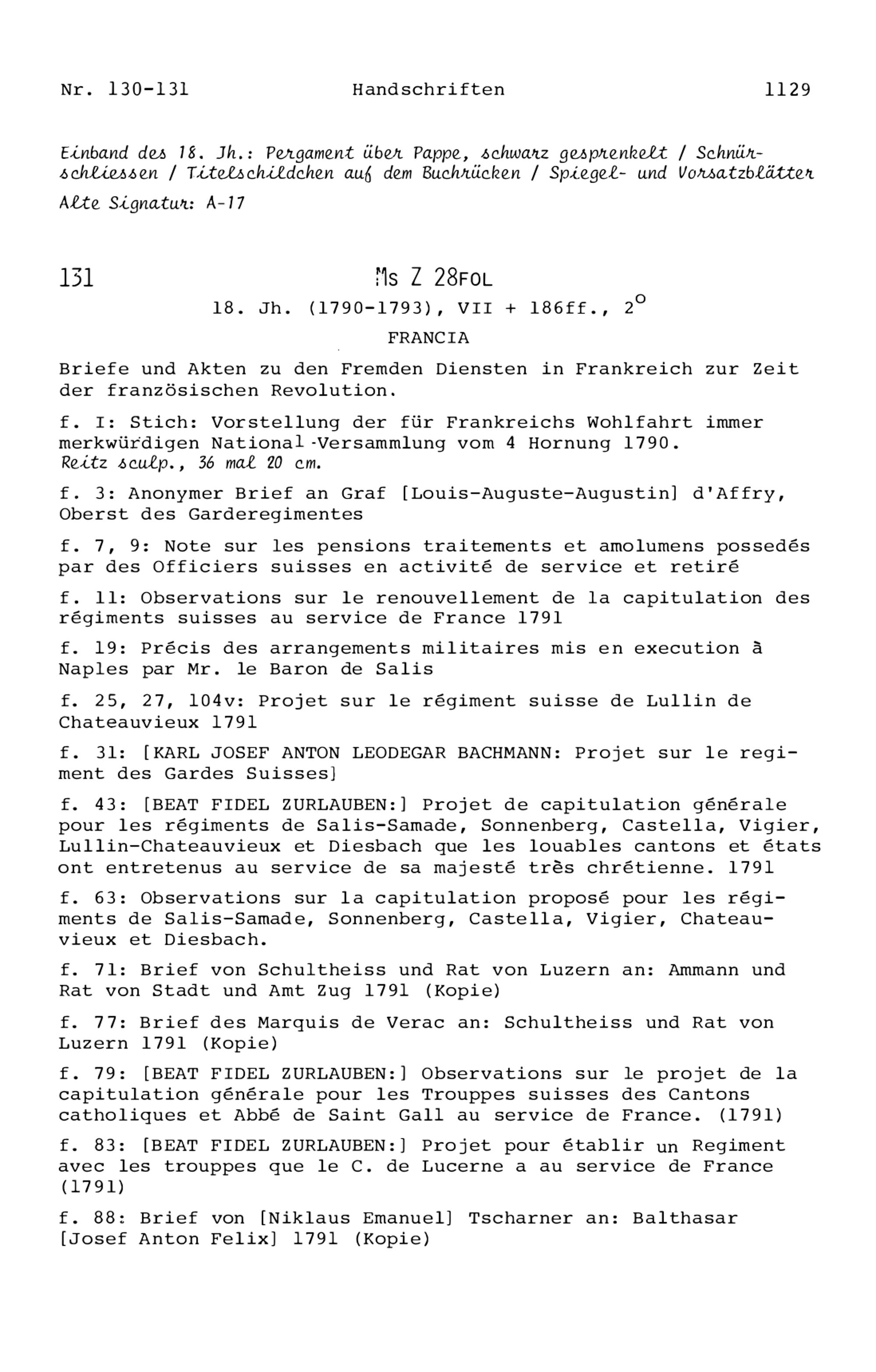 20. Bibliograohie der Arbeiten von Beat Fidel Zurlauben