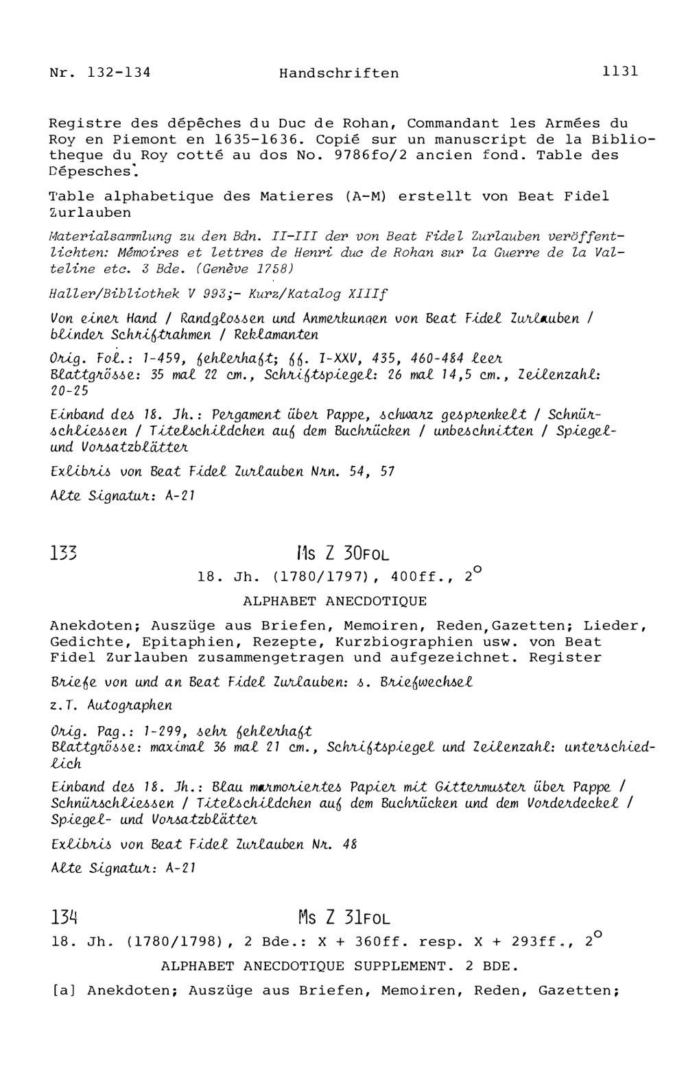 20. Bibliograohie der Arbeiten von Beat Fidel Zurlauben