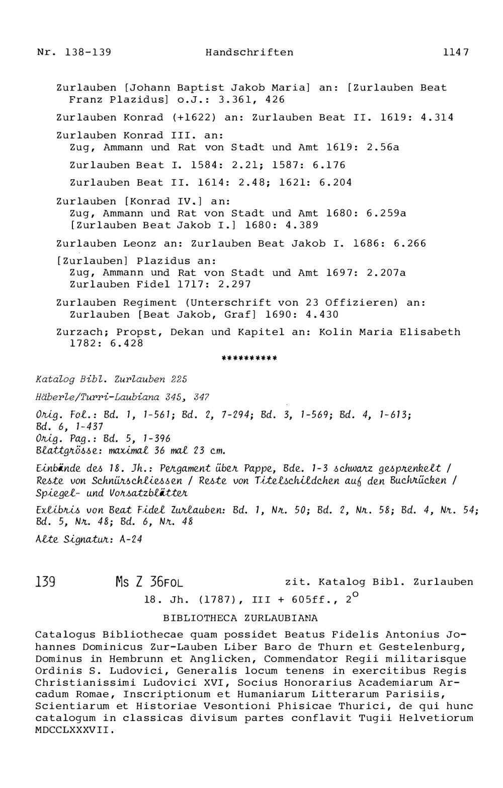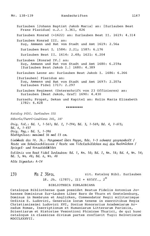 20. Bibliograohie der Arbeiten von Beat Fidel Zurlauben