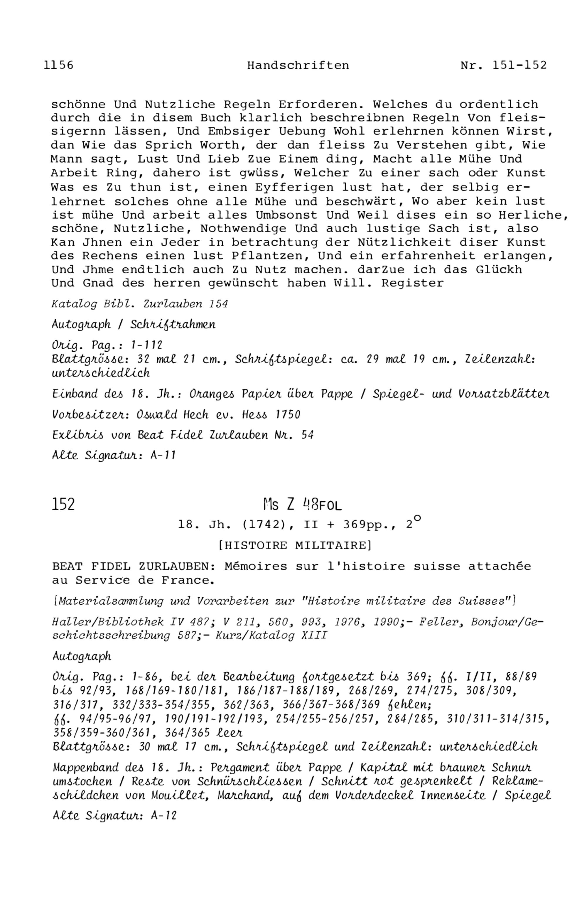 20. Bibliograohie der Arbeiten von Beat Fidel Zurlauben