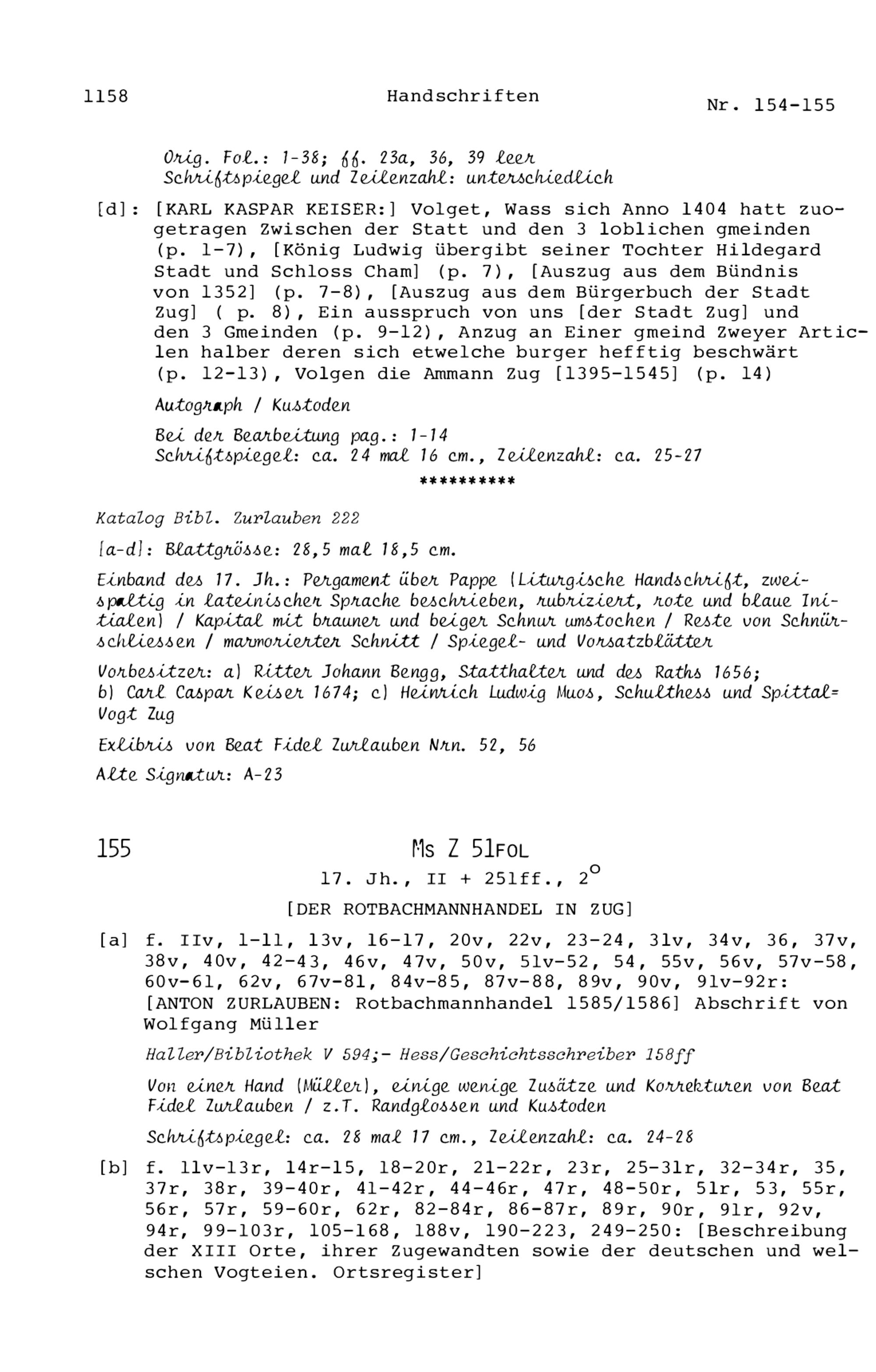 20. Bibliograohie der Arbeiten von Beat Fidel Zurlauben