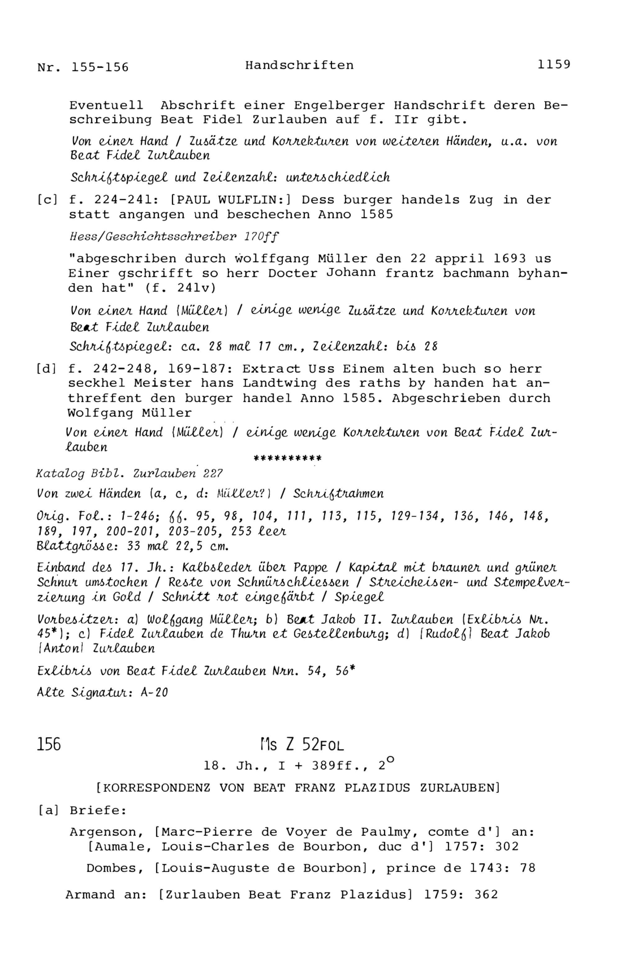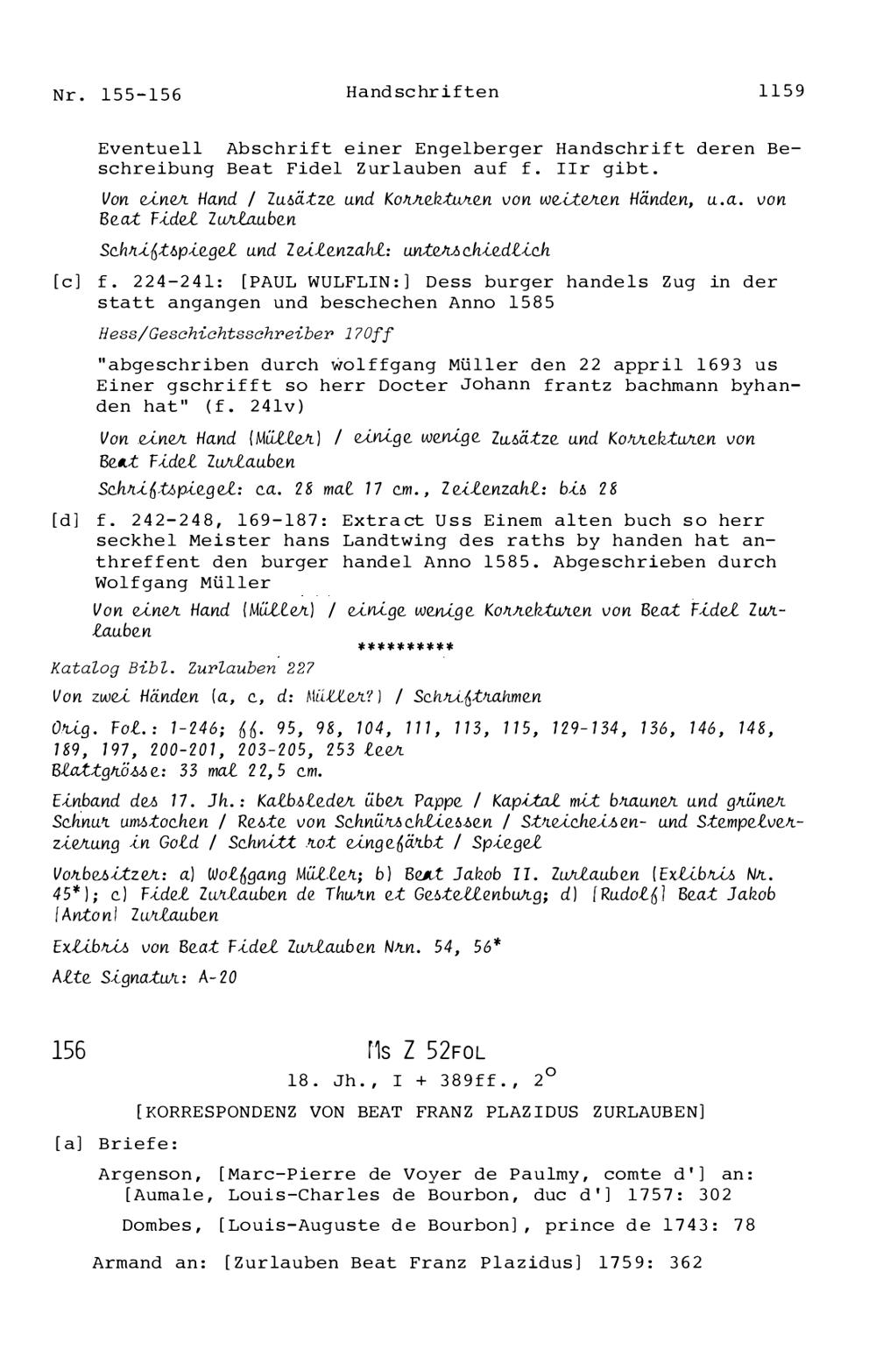 20. Bibliograohie der Arbeiten von Beat Fidel Zurlauben