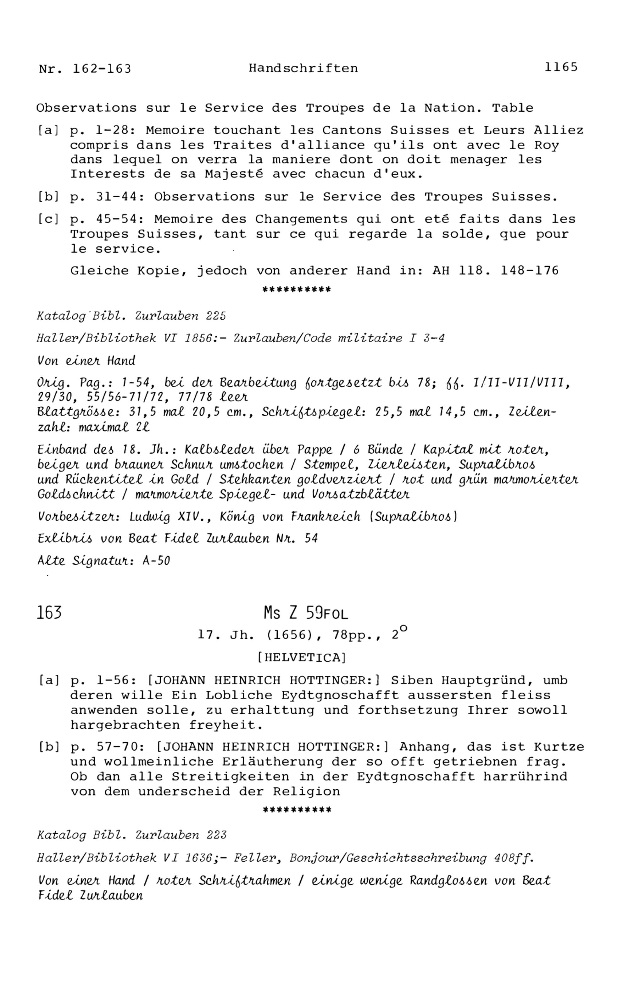 20. Bibliograohie der Arbeiten von Beat Fidel Zurlauben