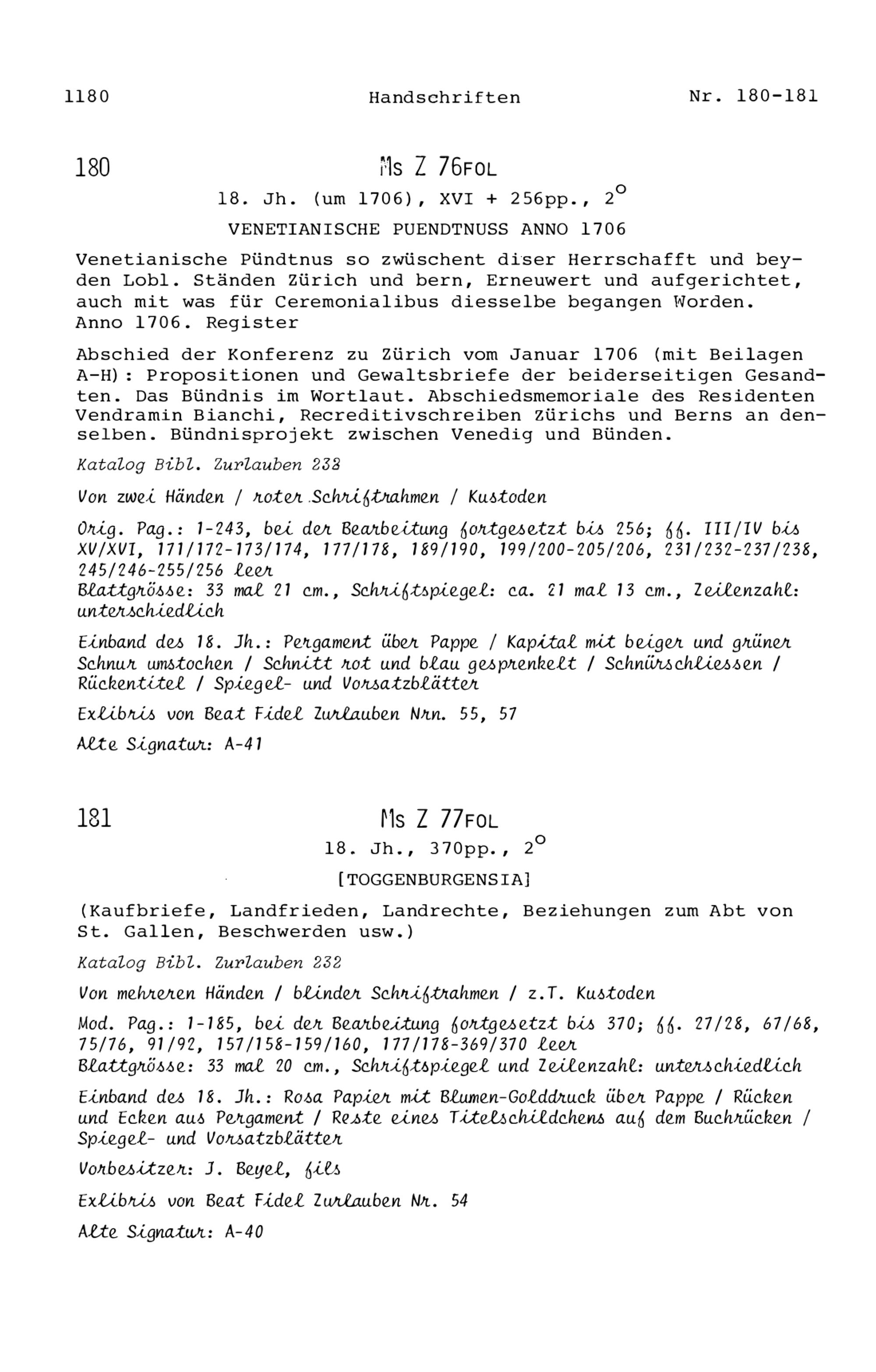 20. Bibliograohie der Arbeiten von Beat Fidel Zurlauben