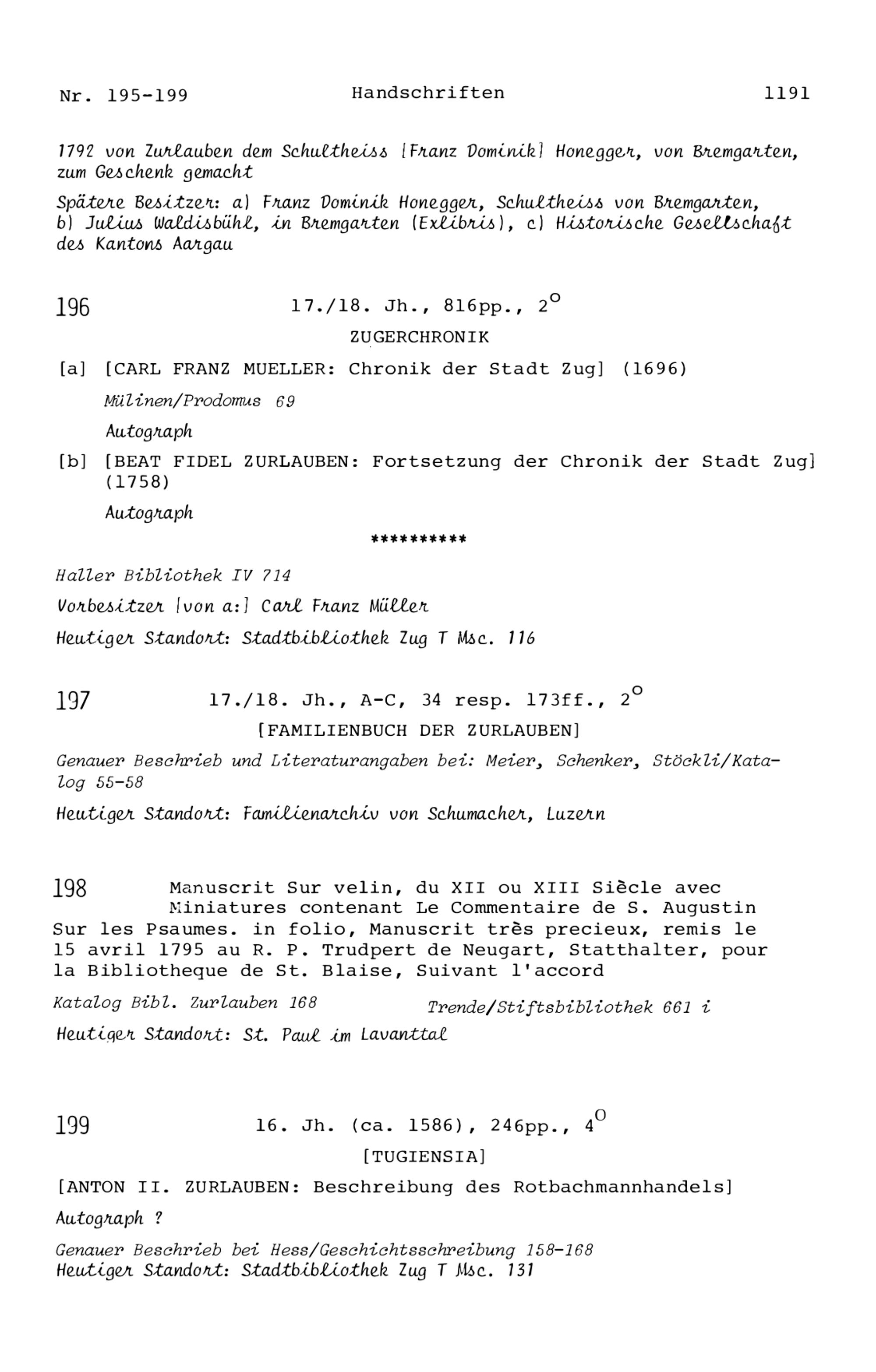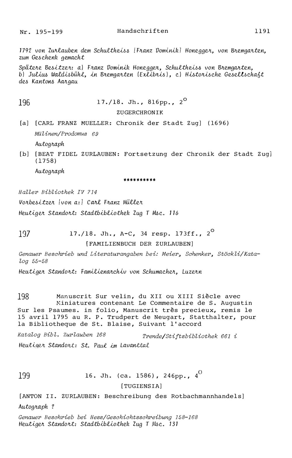20. Bibliograohie der Arbeiten von Beat Fidel Zurlauben