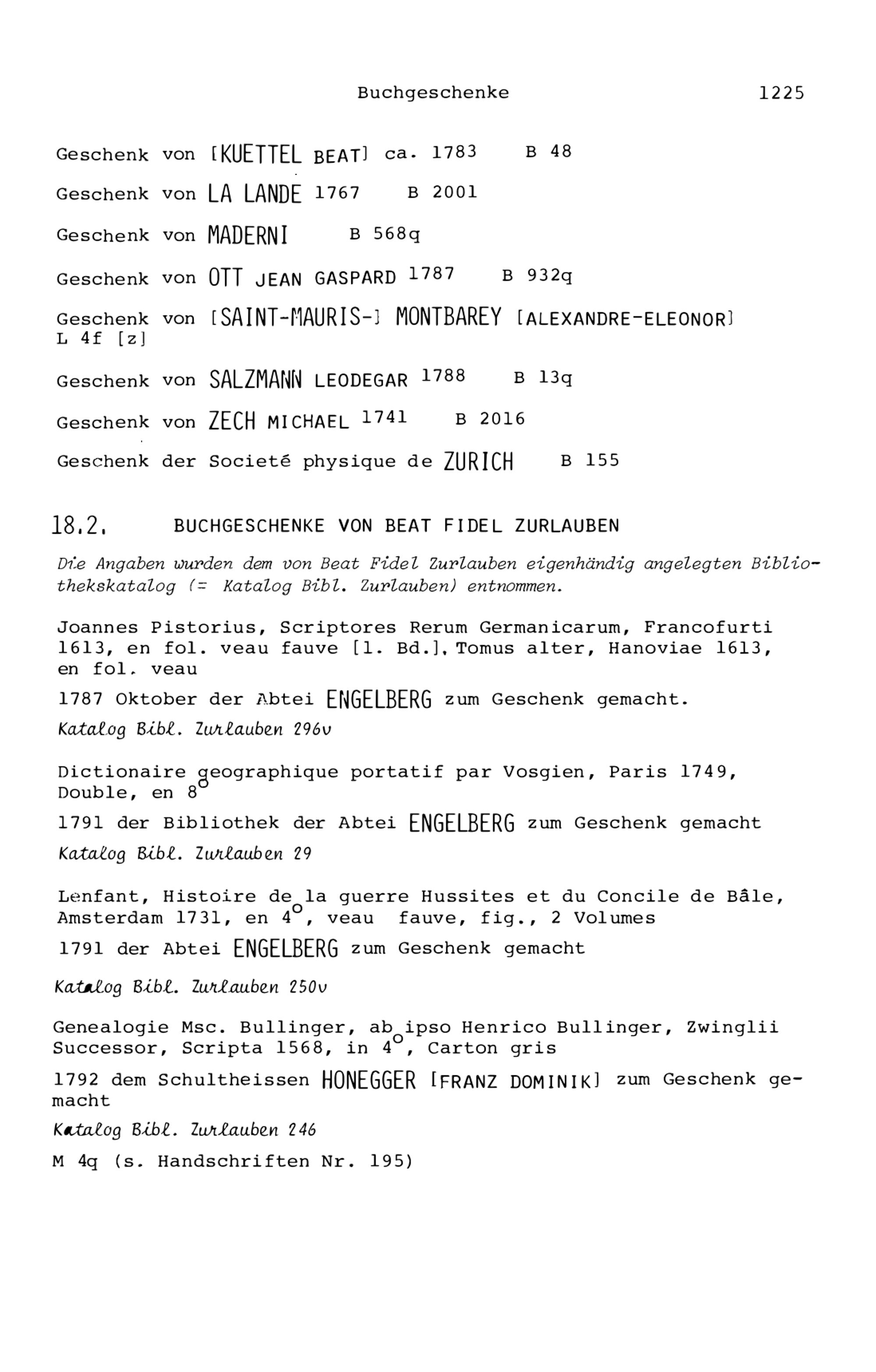 20. Bibliograohie der Arbeiten von Beat Fidel Zurlauben