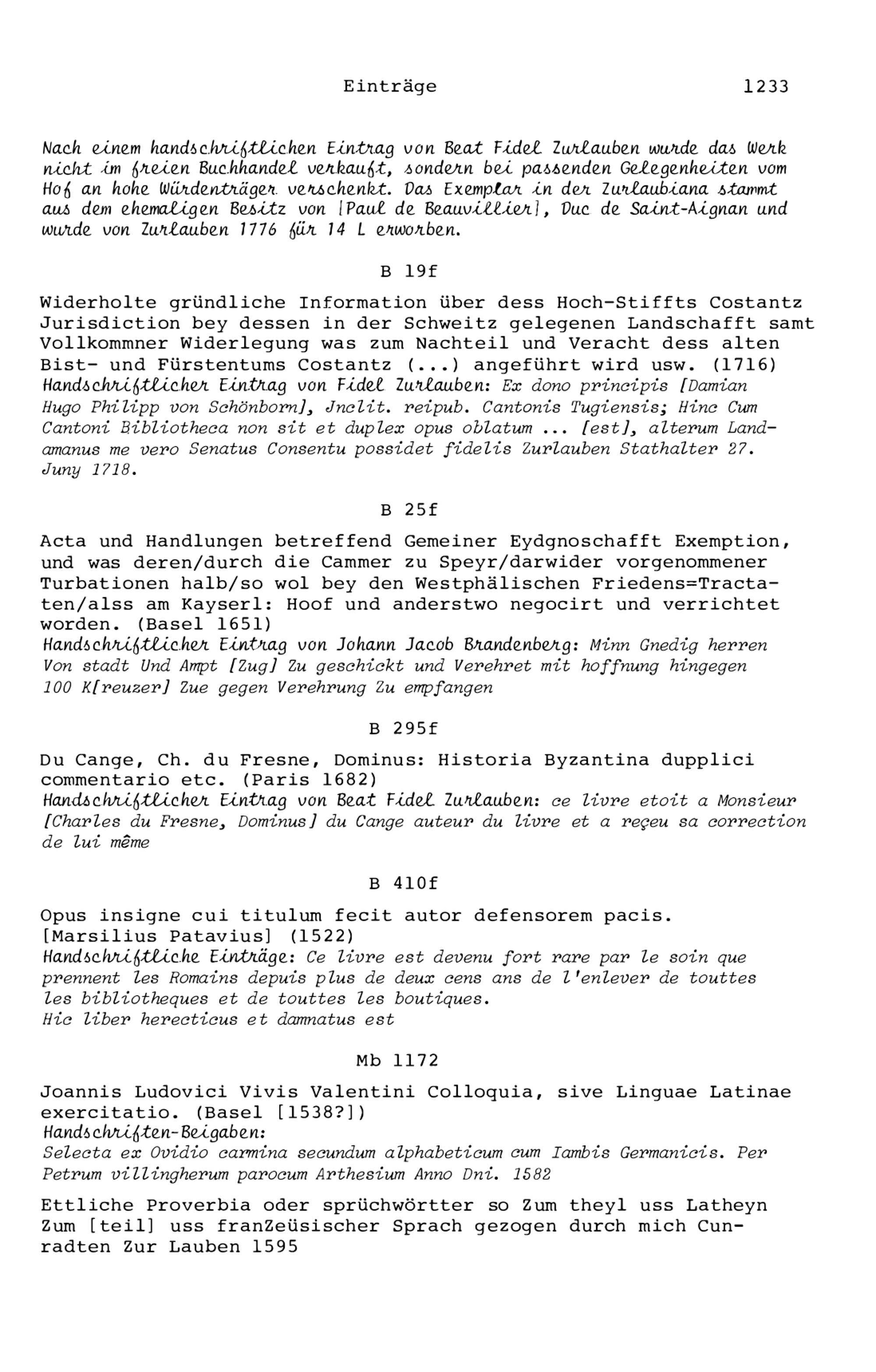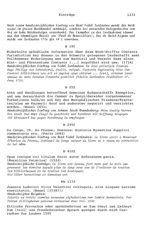20. Bibliograohie der Arbeiten von Beat Fidel Zurlauben