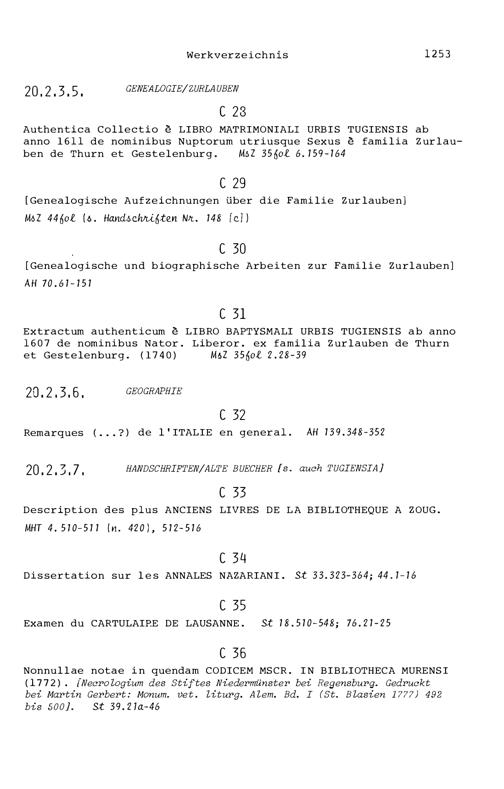 20. Bibliograohie der Arbeiten von Beat Fidel Zurlauben