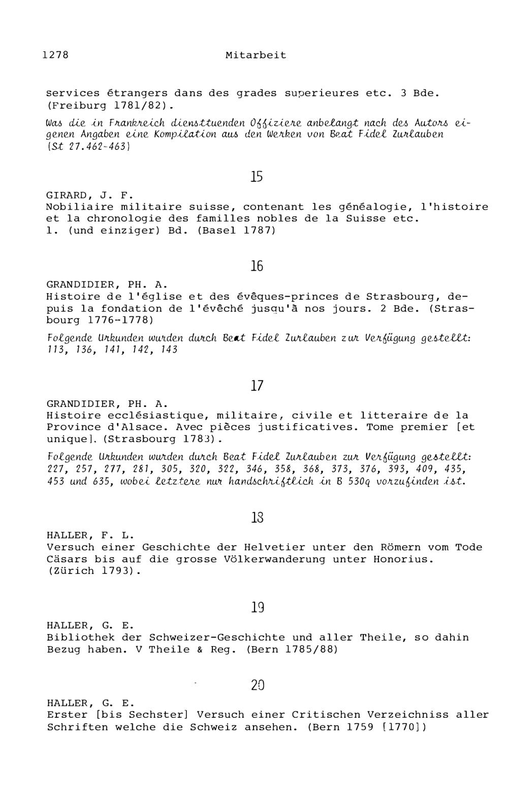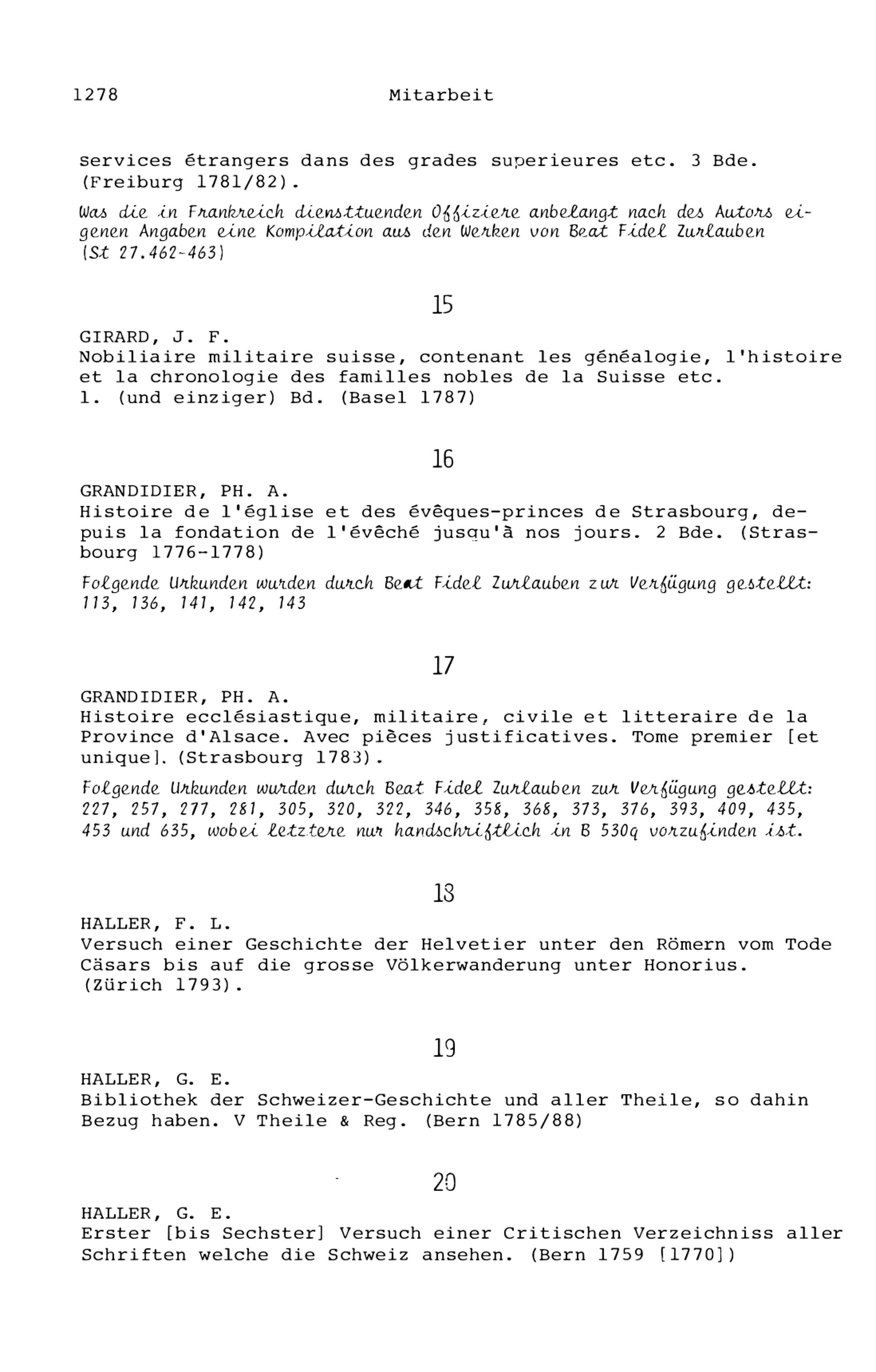 20. Bibliograohie der Arbeiten von Beat Fidel Zurlauben