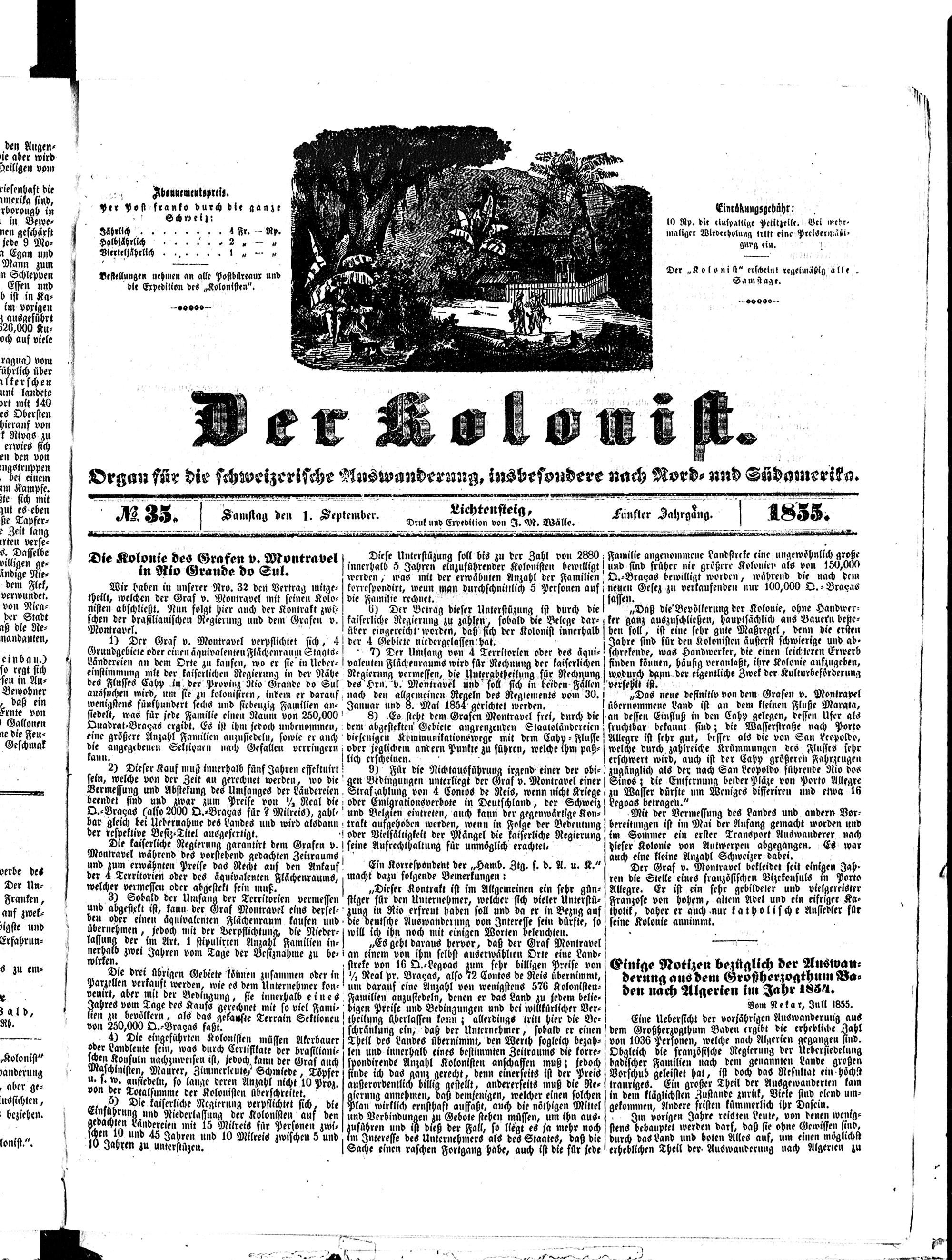 Der Kolonist : Organ zum Schutze, Beistand und Belehrung schweizerischer Auswanderer