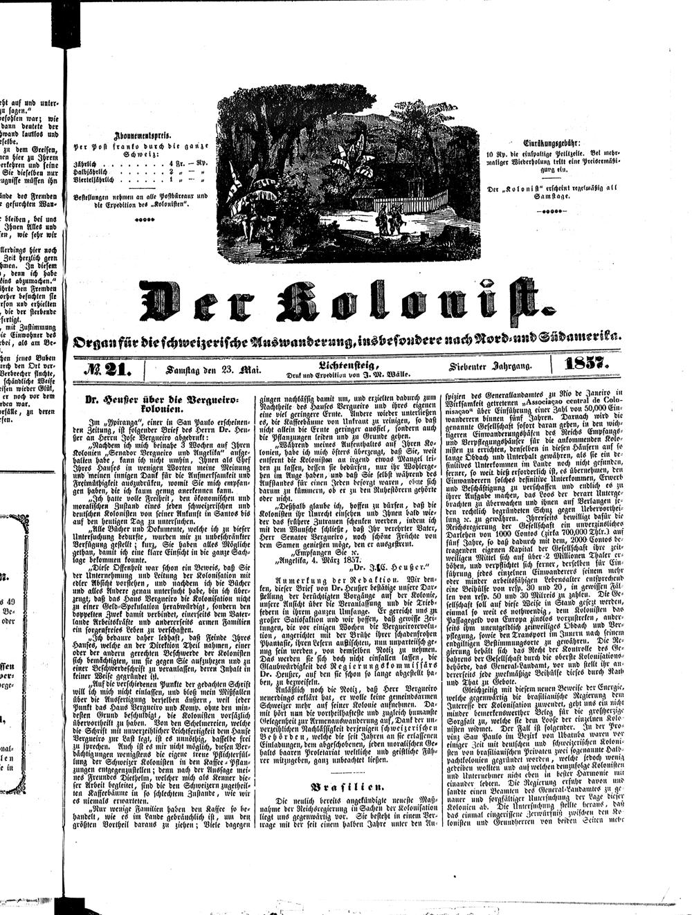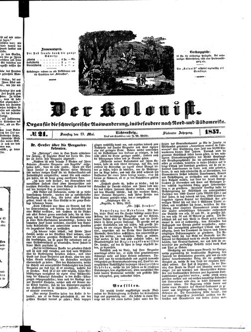 Der Kolonist : Organ zum Schutze, Beistand und Belehrung schweizerischer Auswanderer