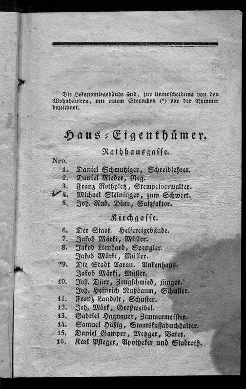 Namens-Verzeichnis der Häuserbesitzer im Stadtbezirk Aarau