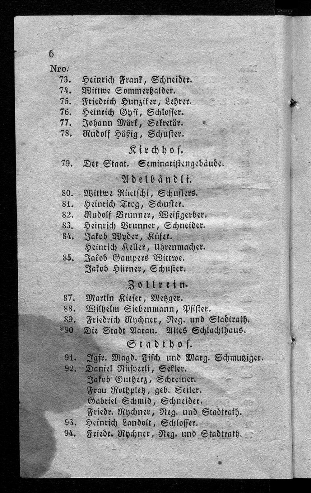 Namens-Verzeichnis der Häuserbesitzer im Stadtbezirk Aarau