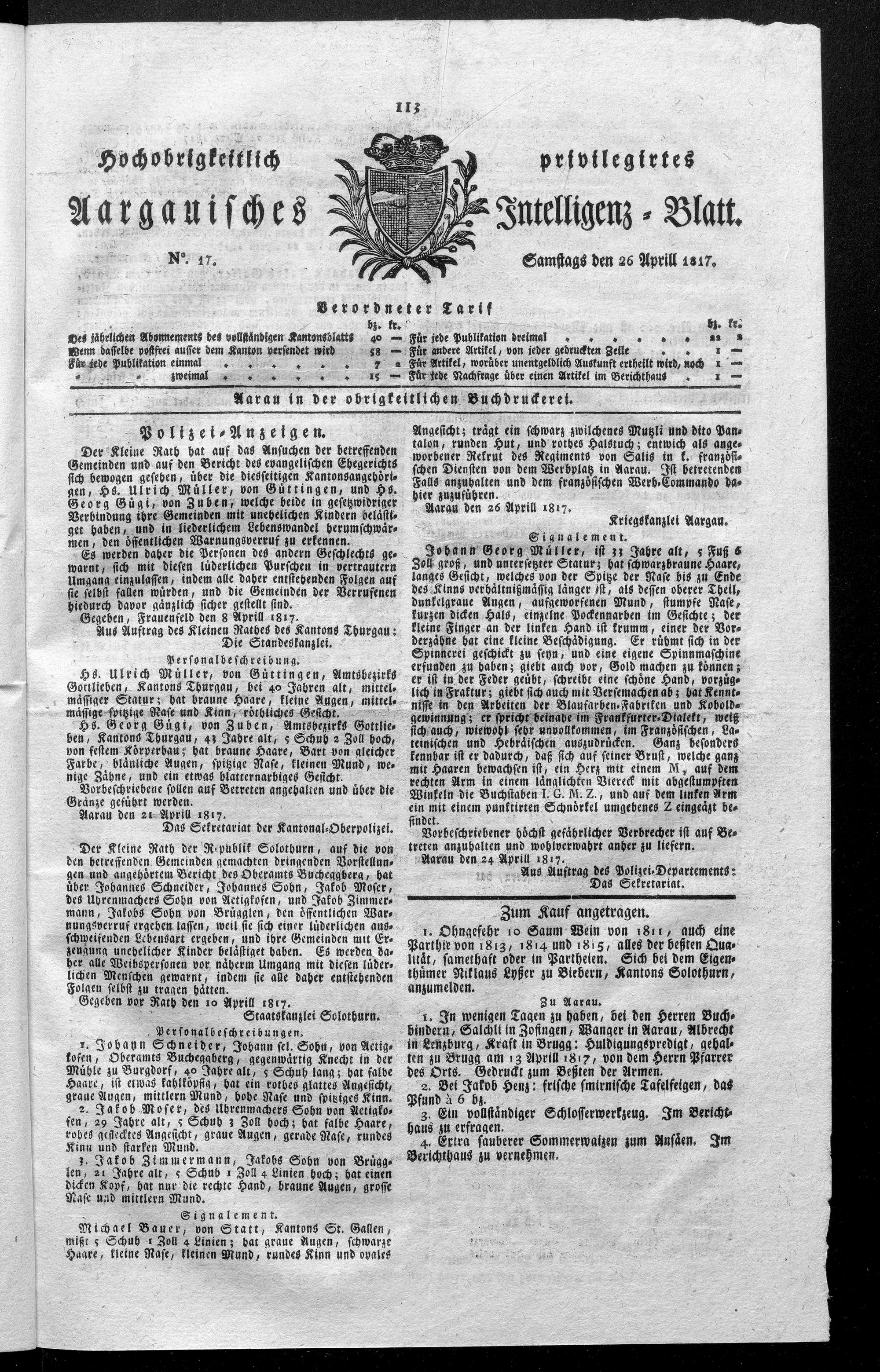 Hochobrigkeitlich privilegirtes Aargauisches Intelligenz-Blatt