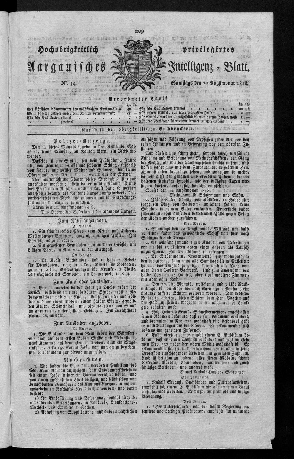 Hochobrigkeitlich privilegirtes Aargauisches Intelligenz-Blatt