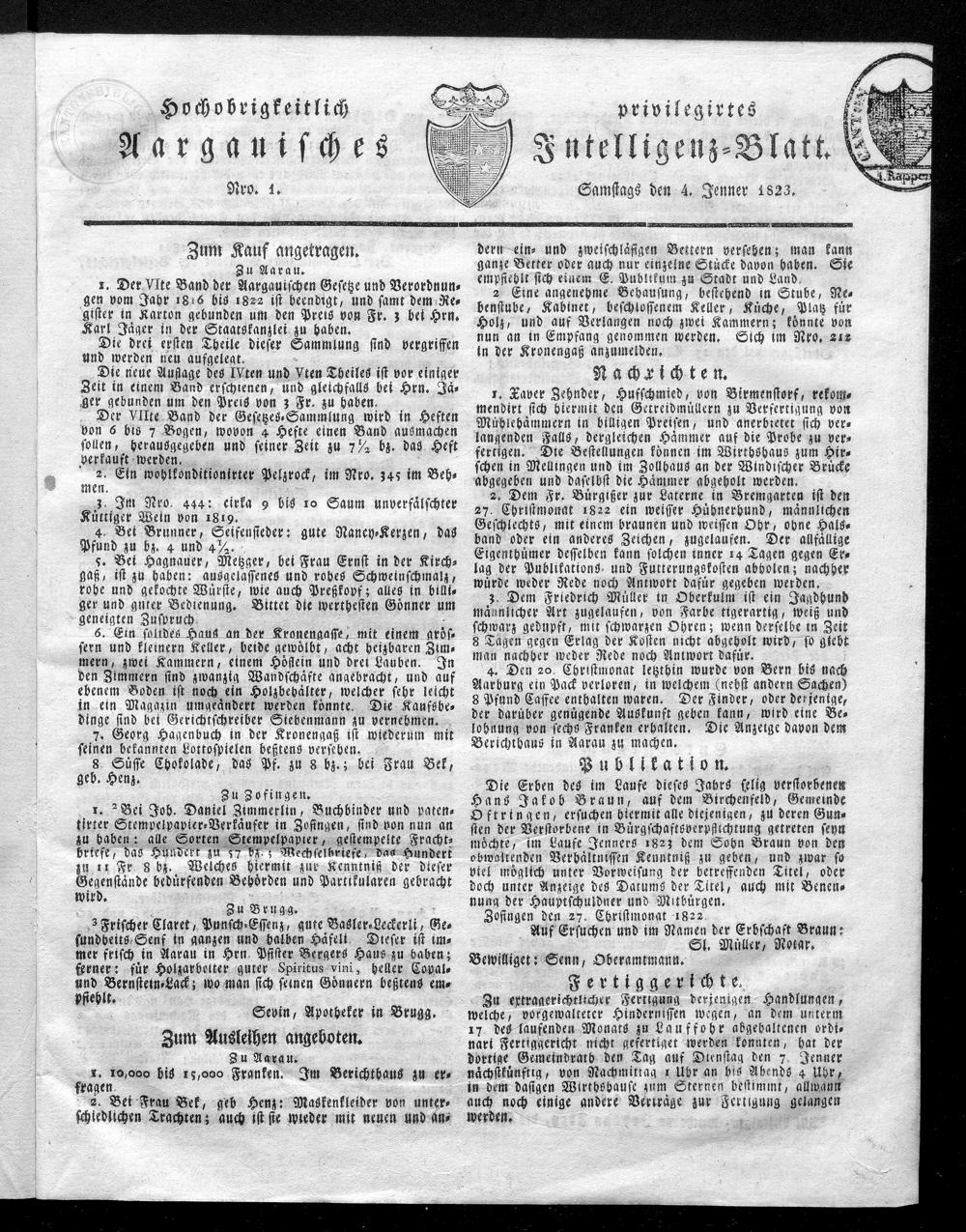 Hochobrigkeitlich privilegirtes Aargauisches Intelligenz-Blatt