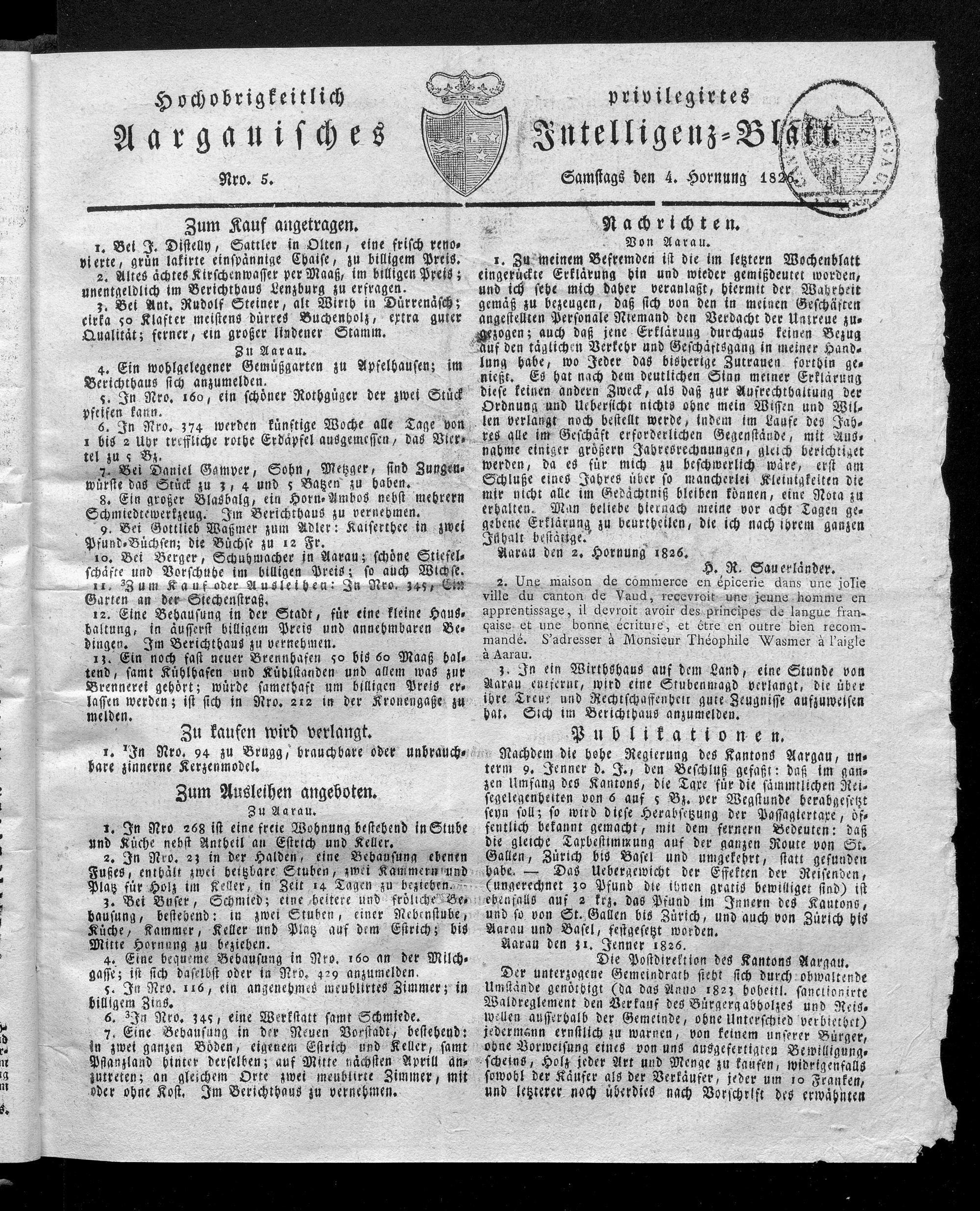 Hochobrigkeitlich privilegirtes Aargauisches Intelligenz-Blatt