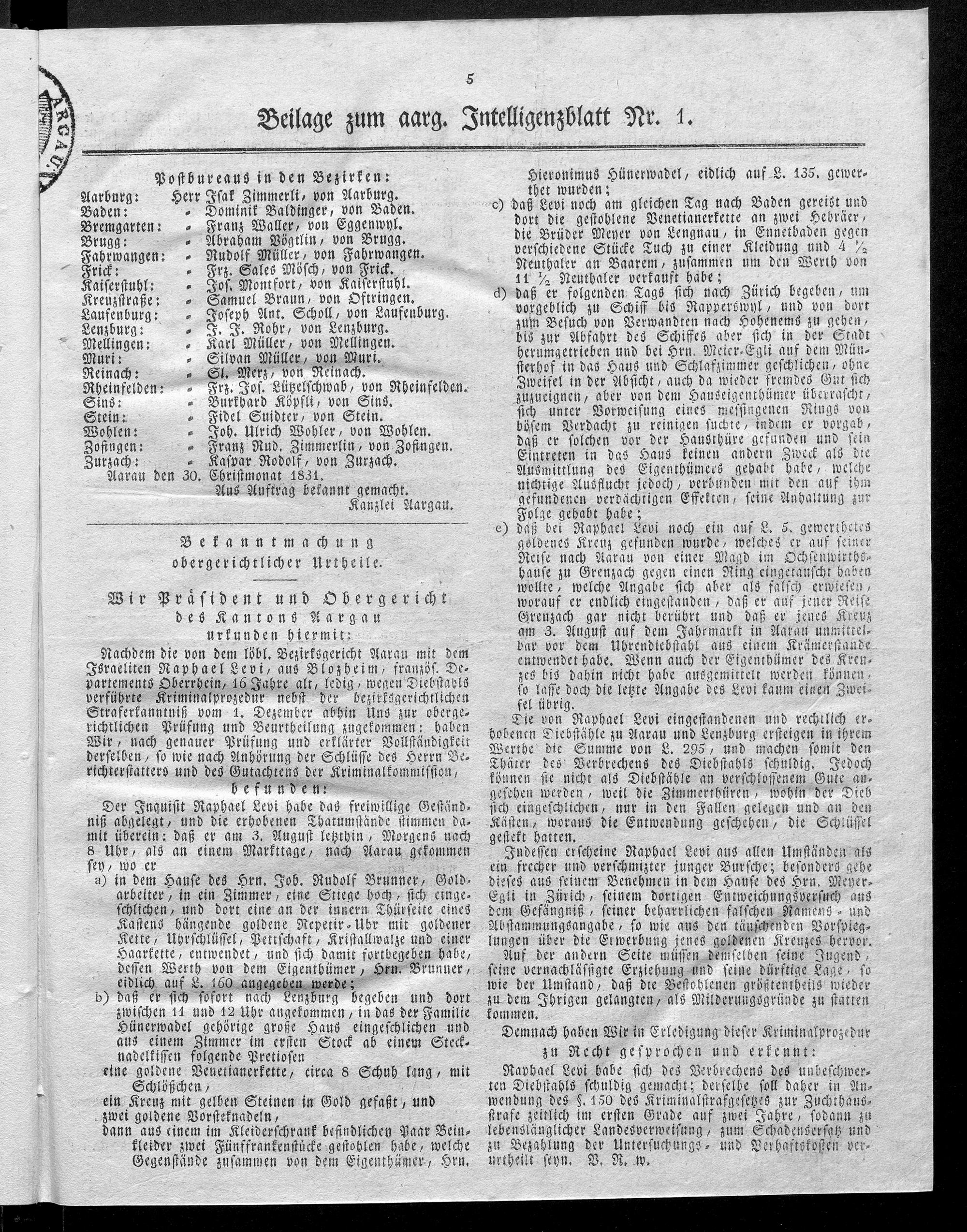Hochobrigkeitlich privilegirtes Aargauisches Intelligenz-Blatt