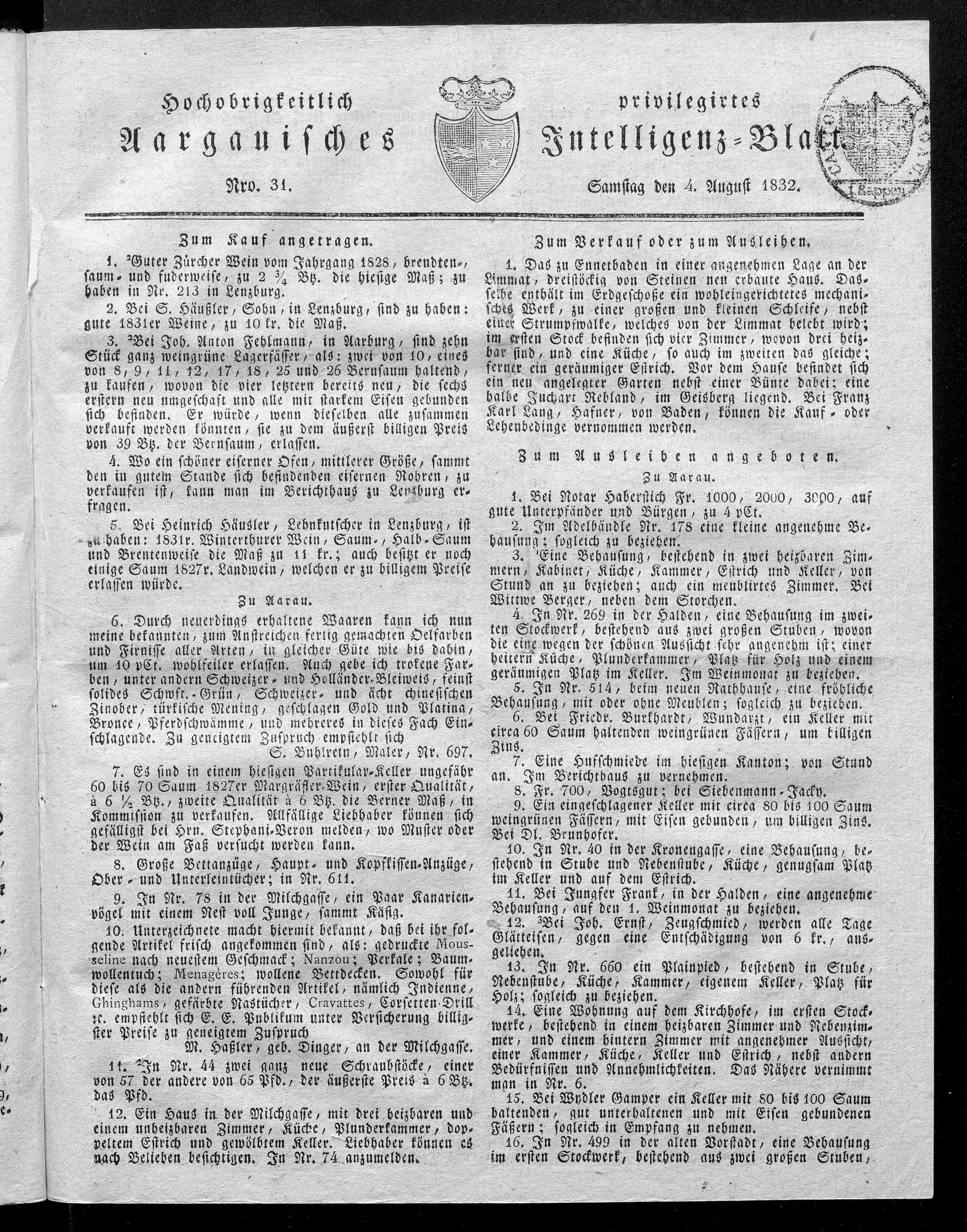 Hochobrigkeitlich privilegirtes Aargauisches Intelligenz-Blatt