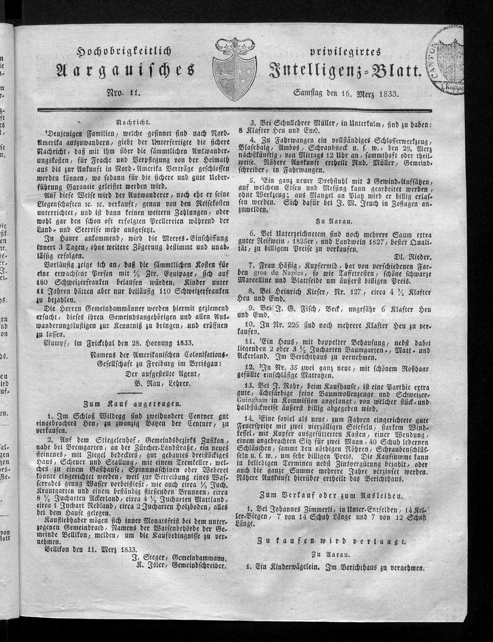 Hochobrigkeitlich privilegirtes Aargauisches Intelligenz-Blatt