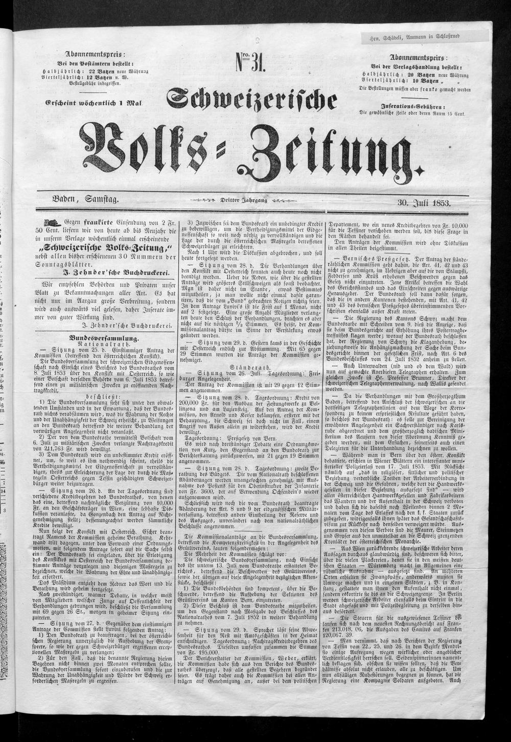 Schweizerische Volks-Zeitung. 1851-1857