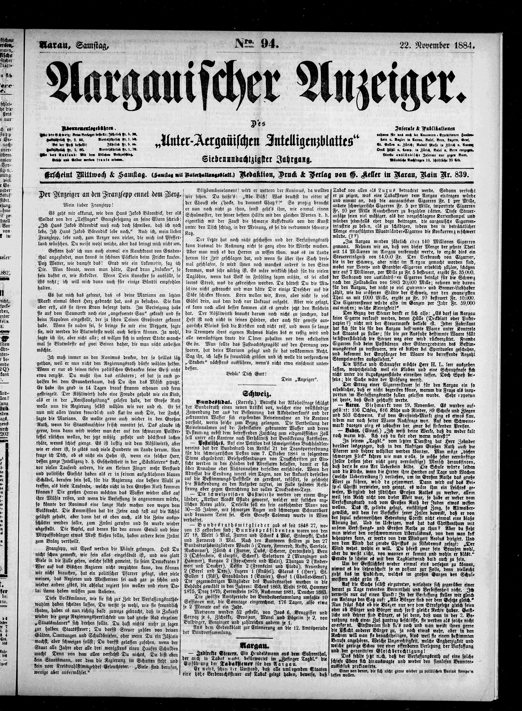 Aargauischer Anzeiger. 1797-1918