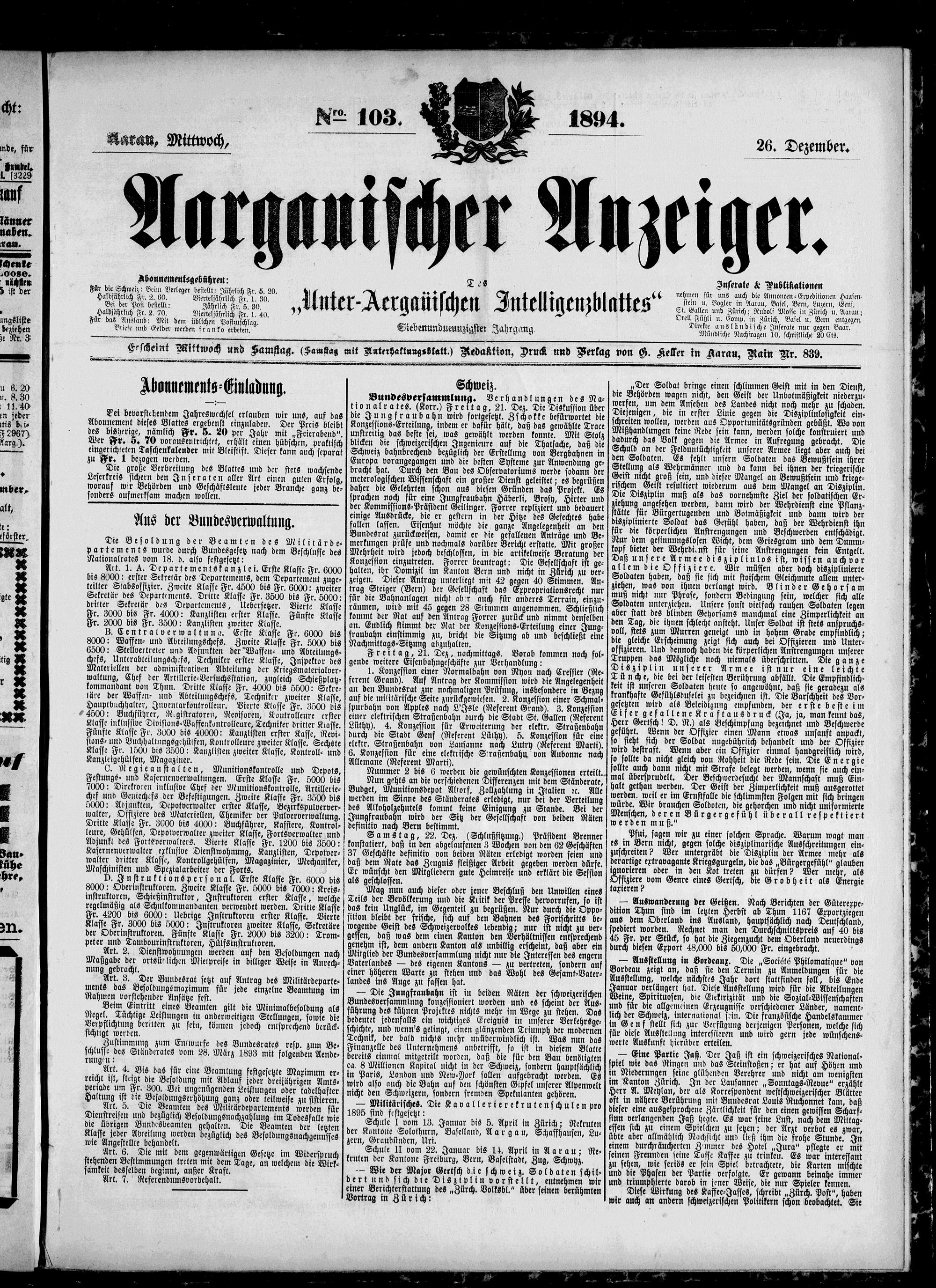 Aargauischer Anzeiger. 1797-1918