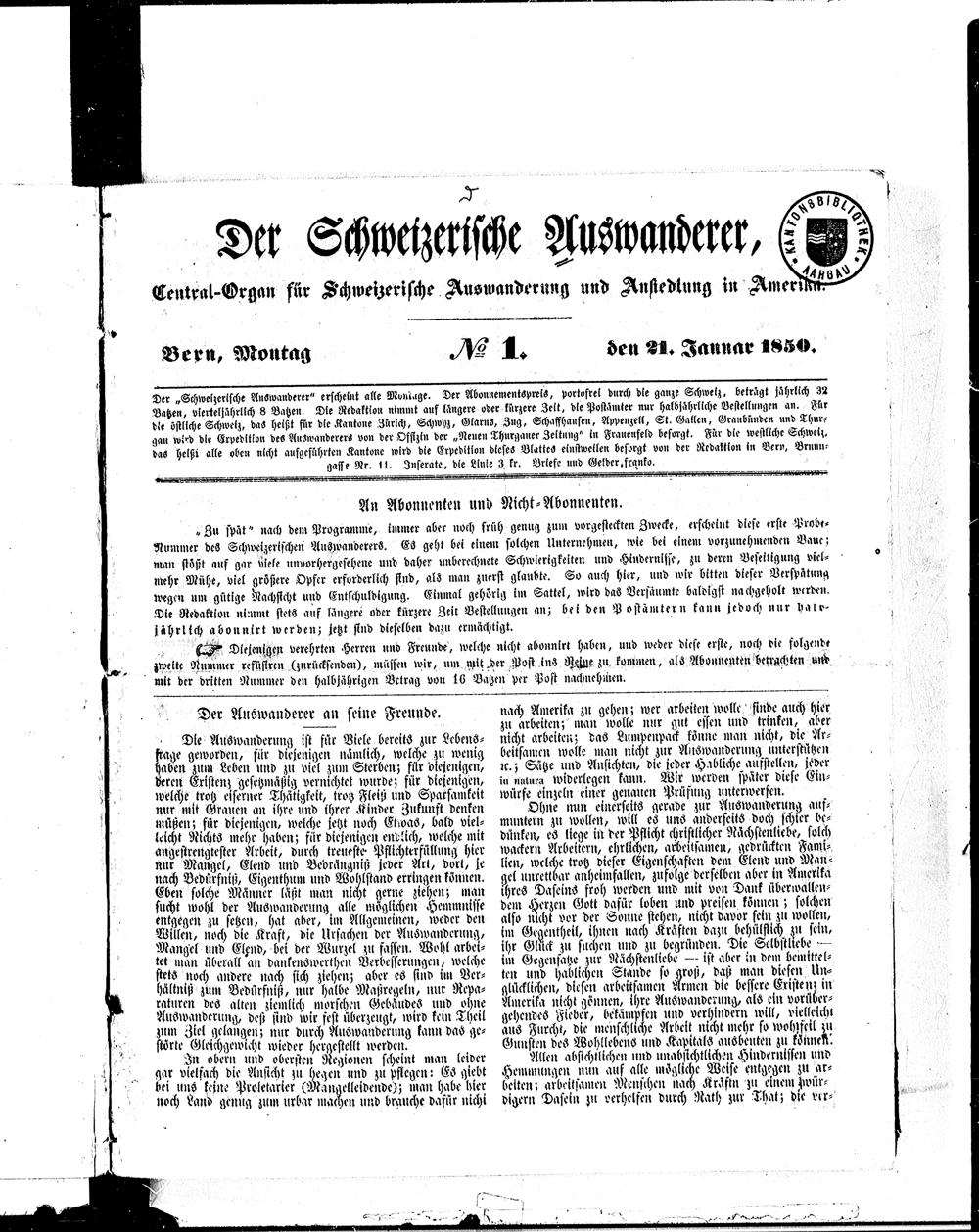 Der Schweizerische Auswanderer. 1850-1850
