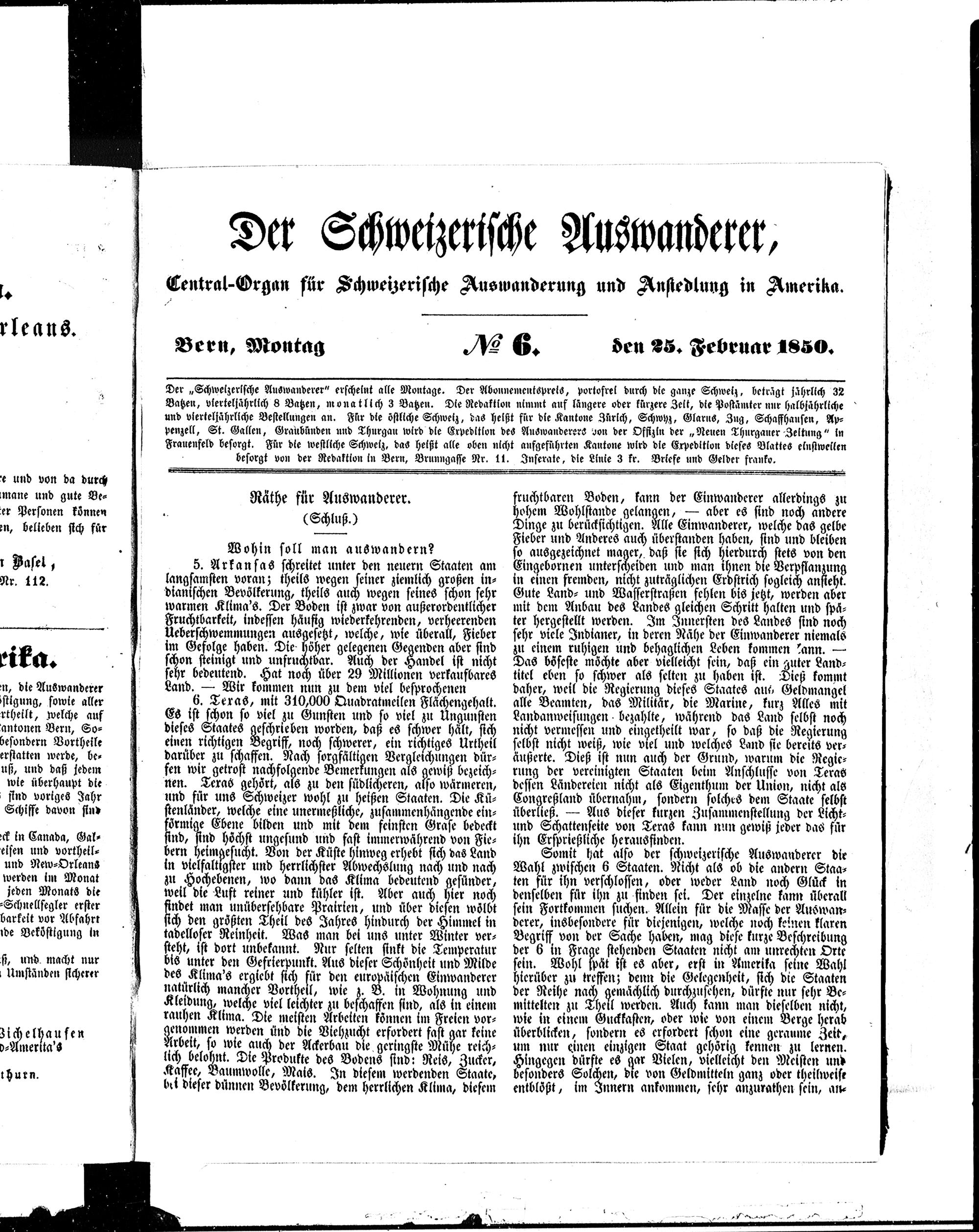 Der Schweizerische Auswanderer : Central-Organ für schweizerische Auswanderung und Ansiedlung in Amerika
