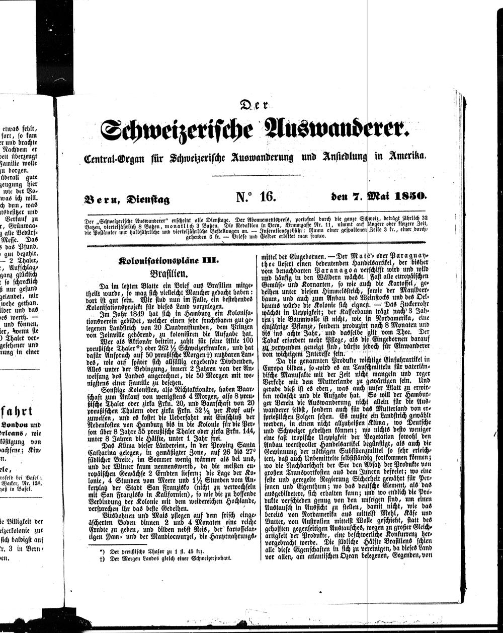 Der Schweizerische Auswanderer. 1850-1850