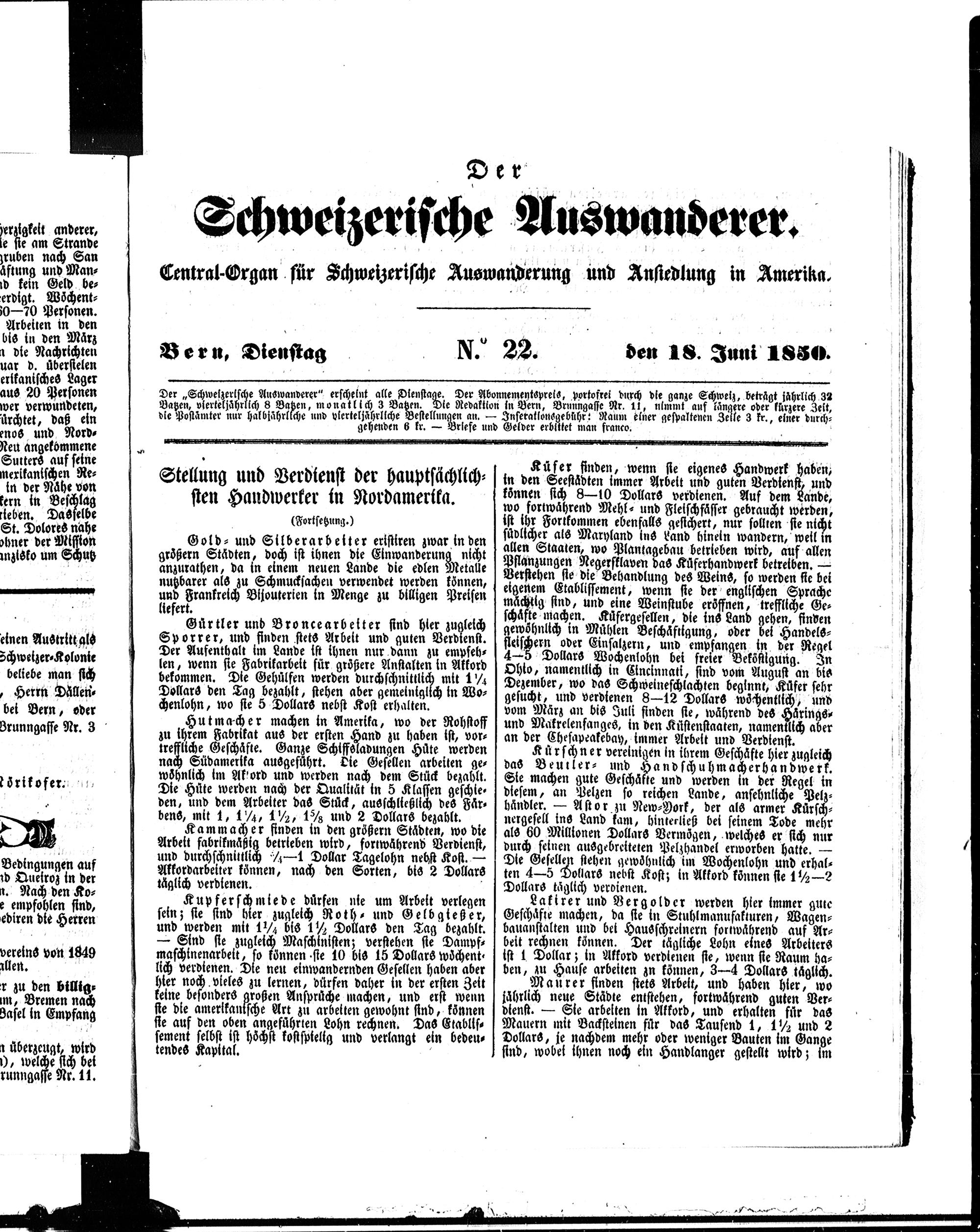 Der Schweizerische Auswanderer : Central-Organ für schweizerische Auswanderung und Ansiedlung in Amerika
