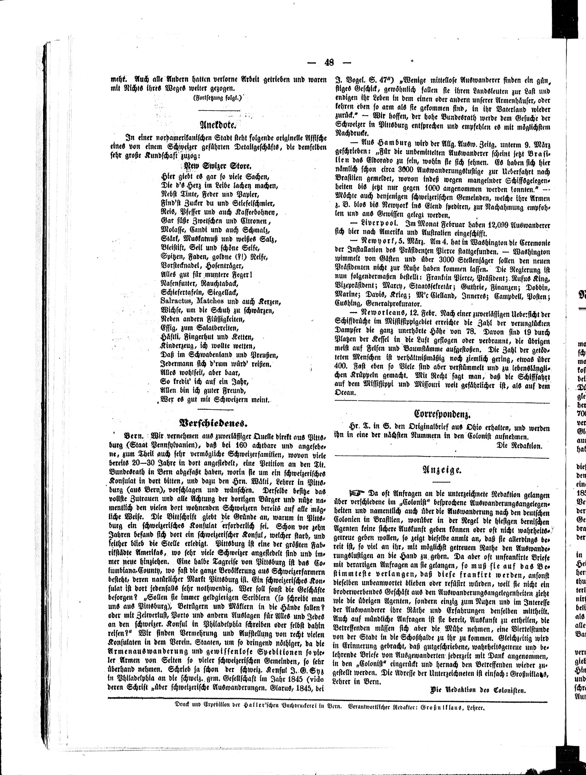 Der Kolonist : Organ zum Schutze, Beistand und Belehrung schweizerischer Auswanderer