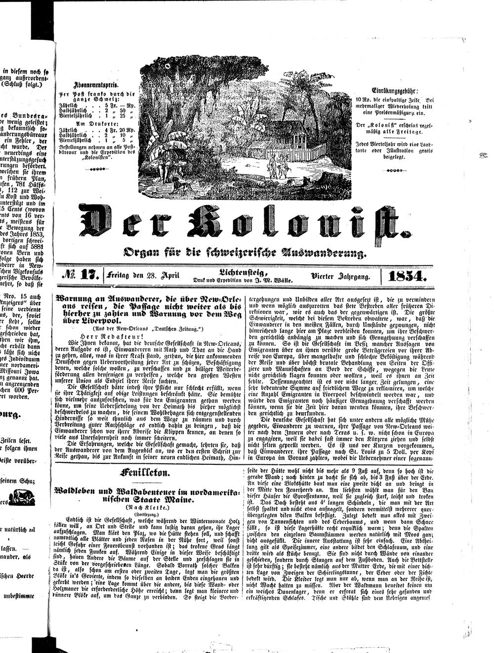 Der Kolonist : Organ zum Schutze, Beistand und Belehrung schweizerischer Auswanderer