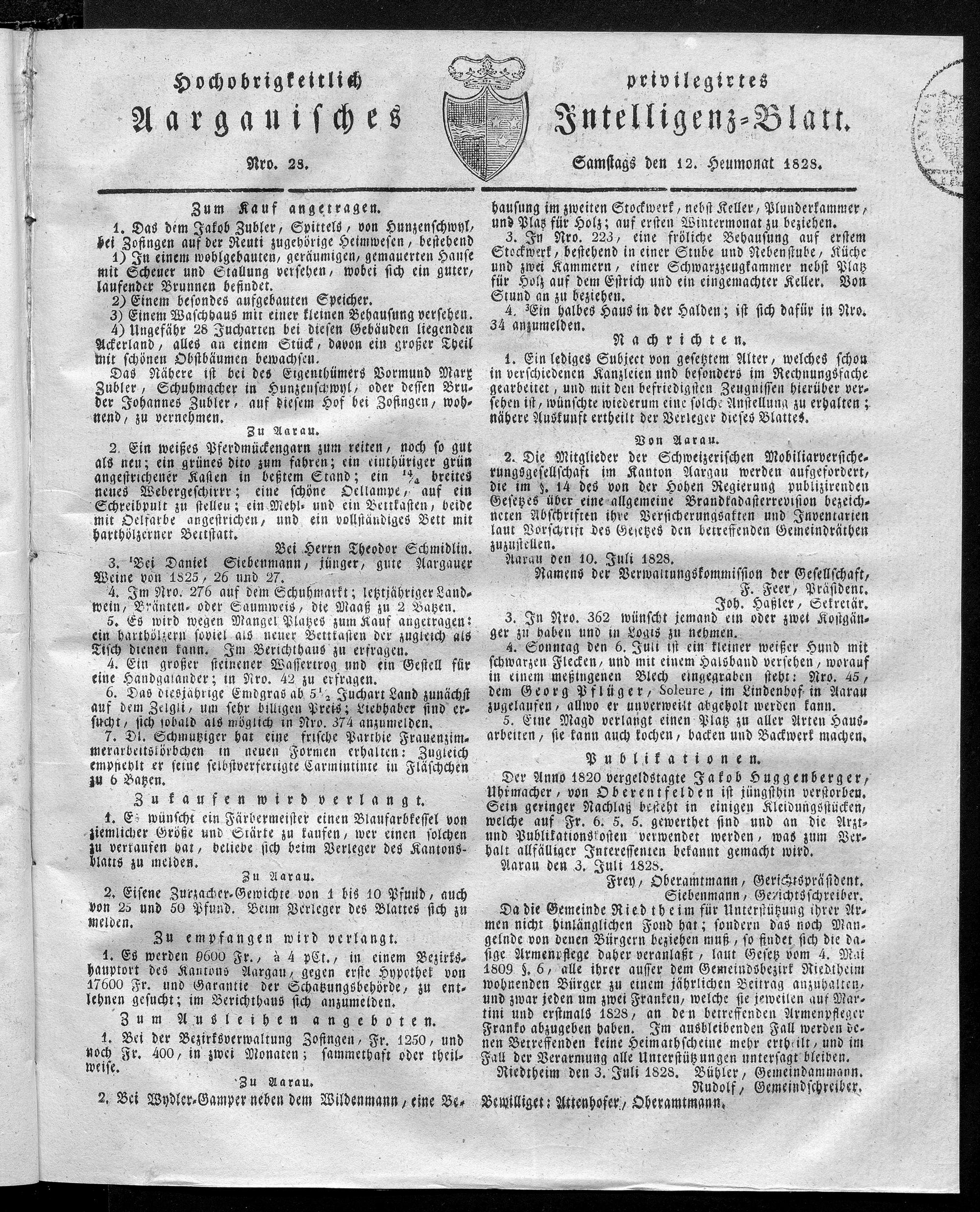 Hochobrigkeitlich privilegirtes Aargauisches Intelligenz-Blatt