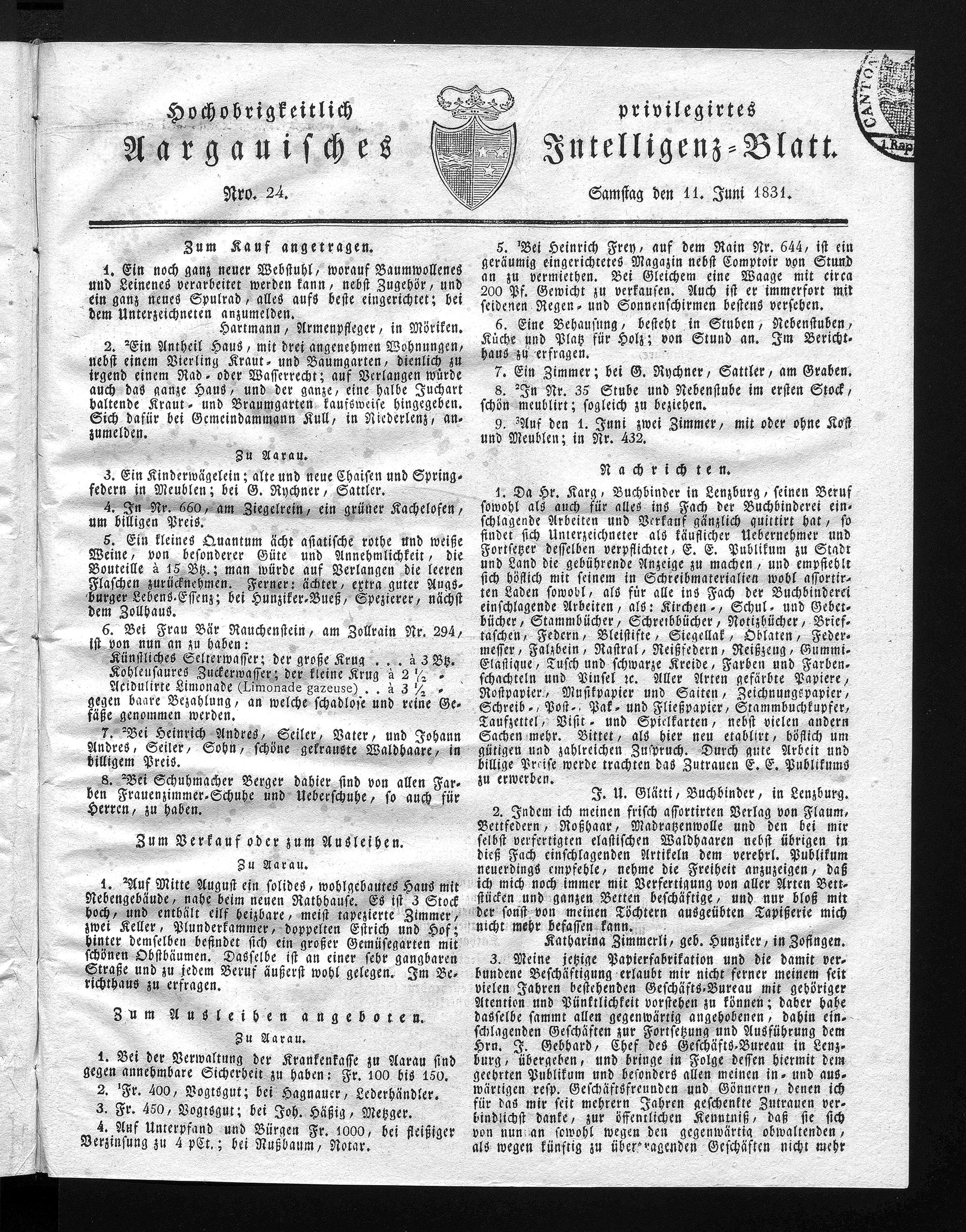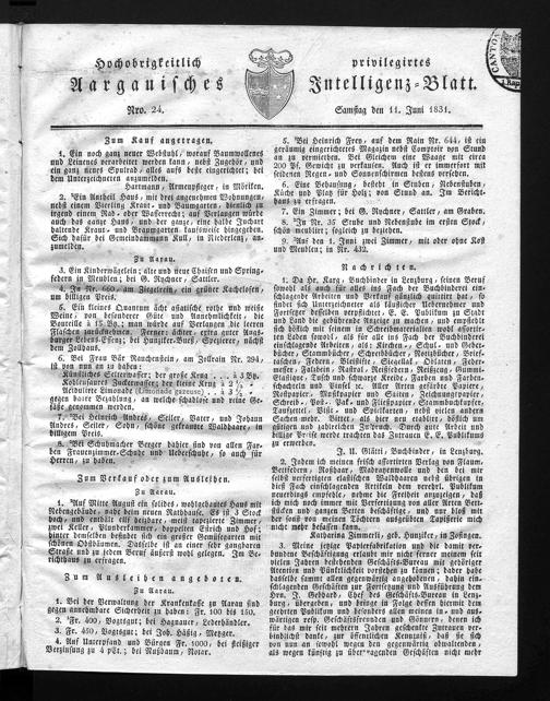Hochobrigkeitlich privilegirtes Aargauisches Intelligenz-Blatt
