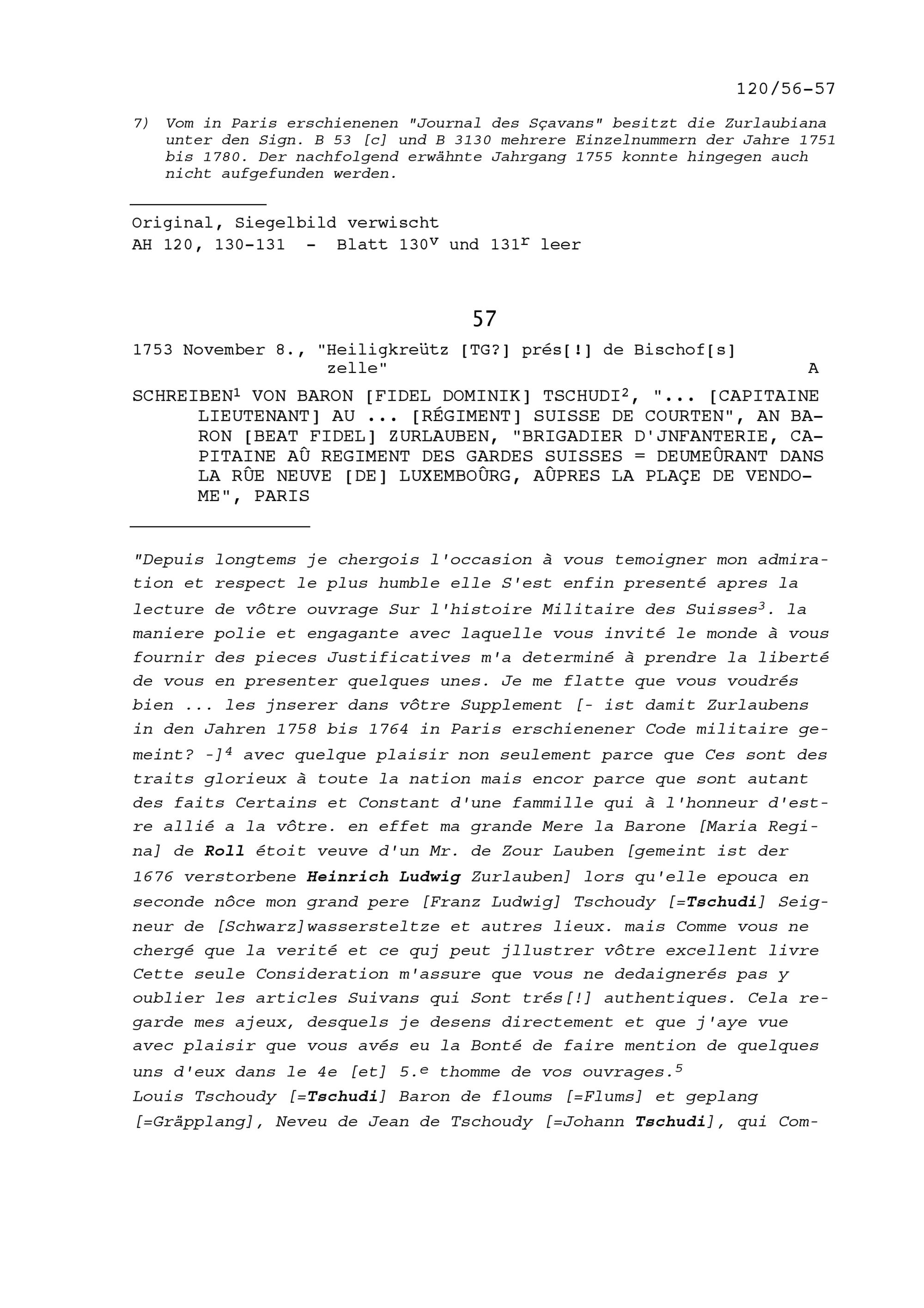 Schreiben von Fidel Dominik Tschudi, Hauptmann im Regiment de Courten, an Beat Fidel Zurlauben, Brigadier, Paris