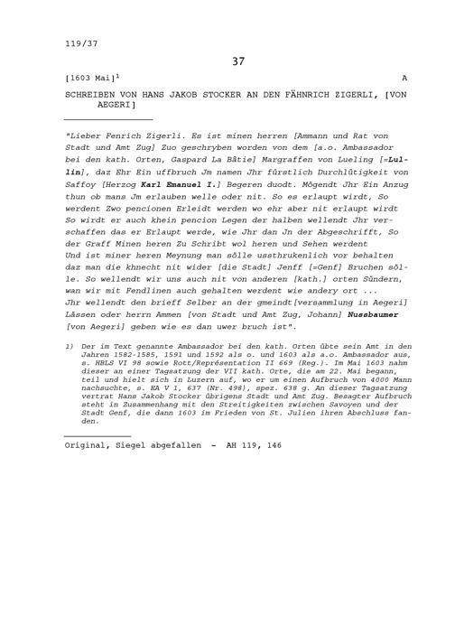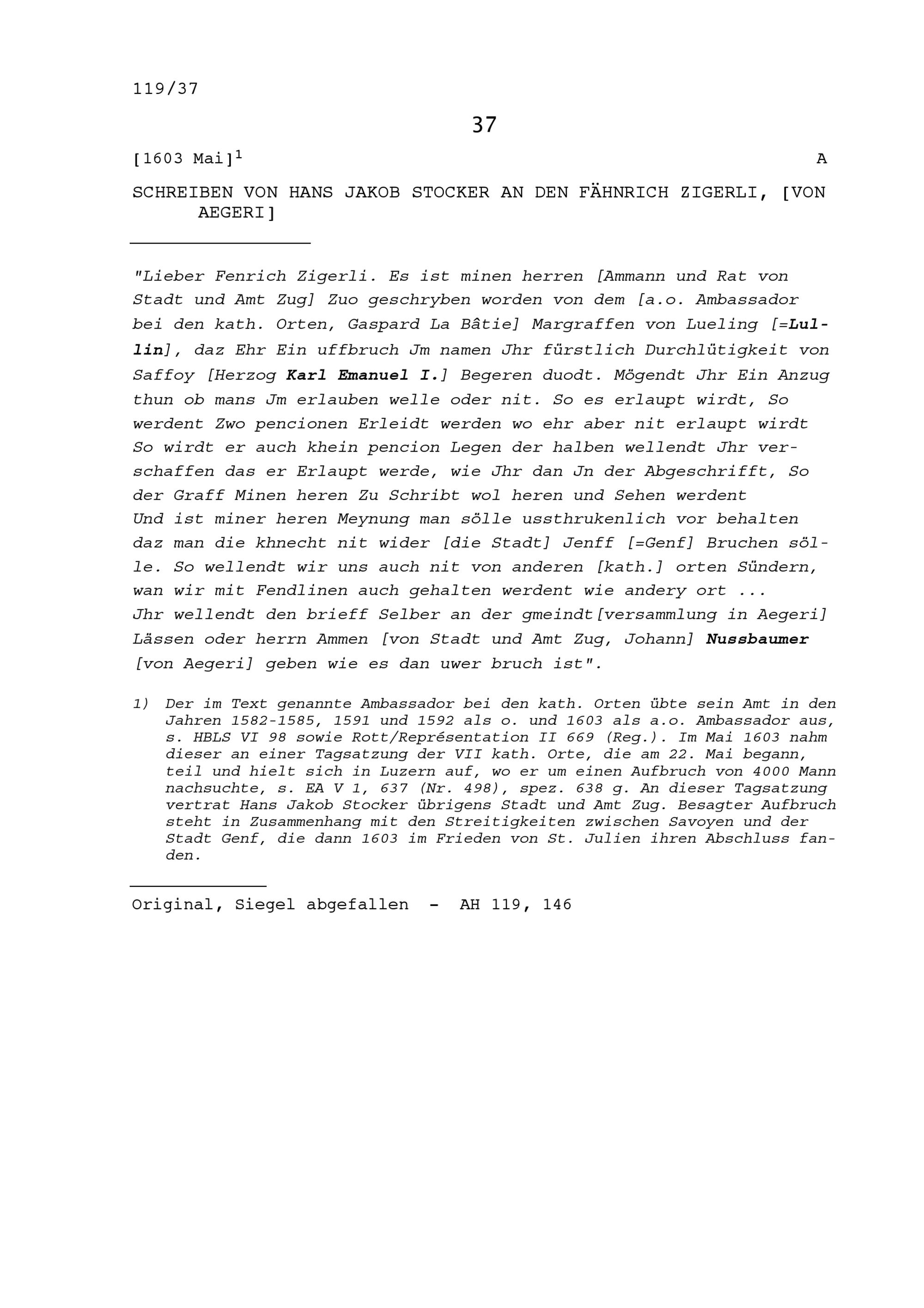 Schreiben von Hans Jakob Stocker an NN Zigerli, Fähnrich, von Ägeri
