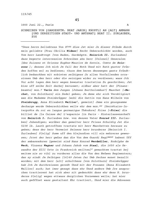 Schreiben von Beat Jakob Knopfli, Gardehauptmann, an Beat II. Zurlauben, Altammann und Stadt- und Amtrat, Zug